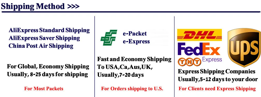 1. Обычно ваши посылки отправляются в течение 1-3 дней.2. Если вы срочно хотите получить свой заказ, пожалуйста, выберите Экспресс-методы, но вы должны оплатить дополнительную плату за доставку.
