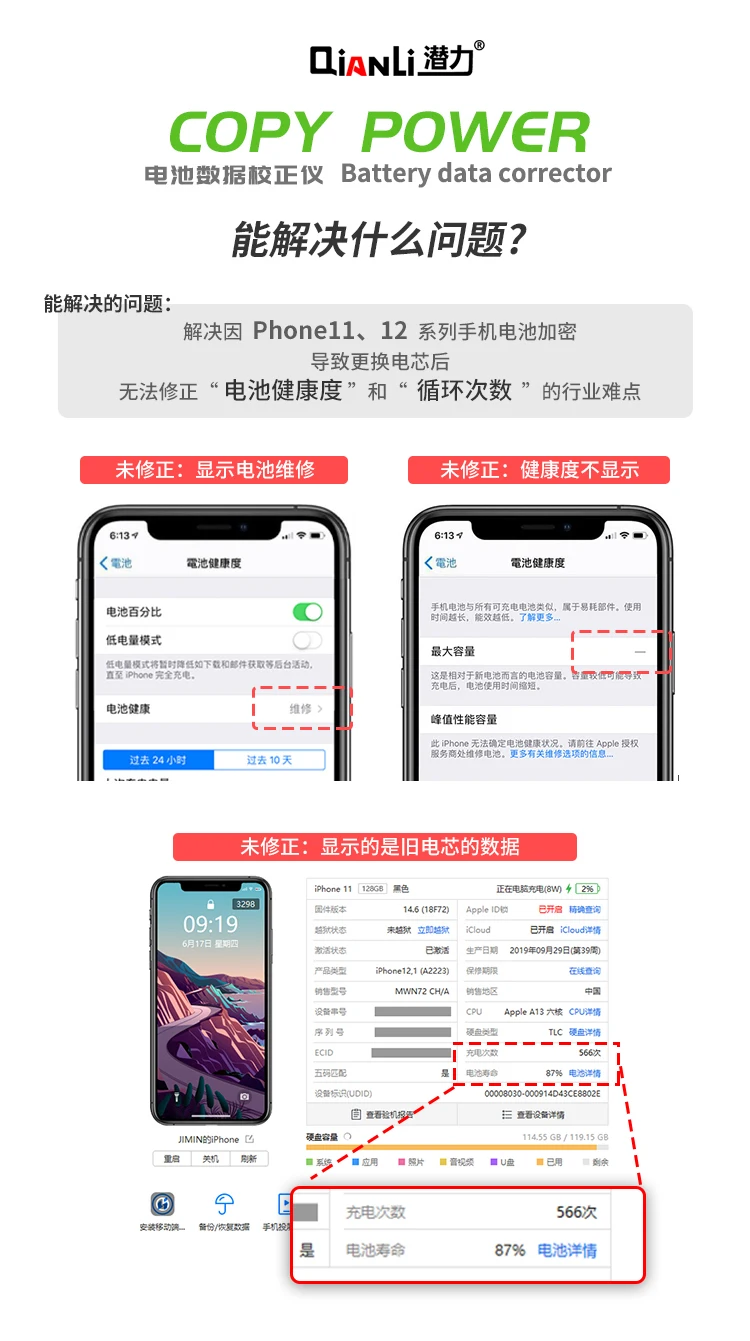 Корректор данных Qianli Power для аккумулятора Phone11 11Pro11Pro, максимальное время цикла, фактор здоровья