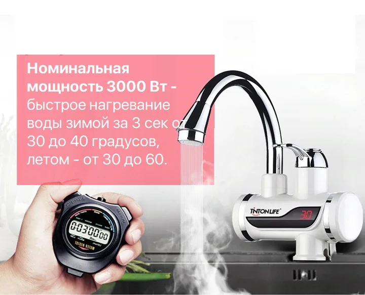 Проточный электрический водонагреватель 3000 Вт для кухни с функциями мгновенный нагрев воды, LED дисплей с показателями темпера