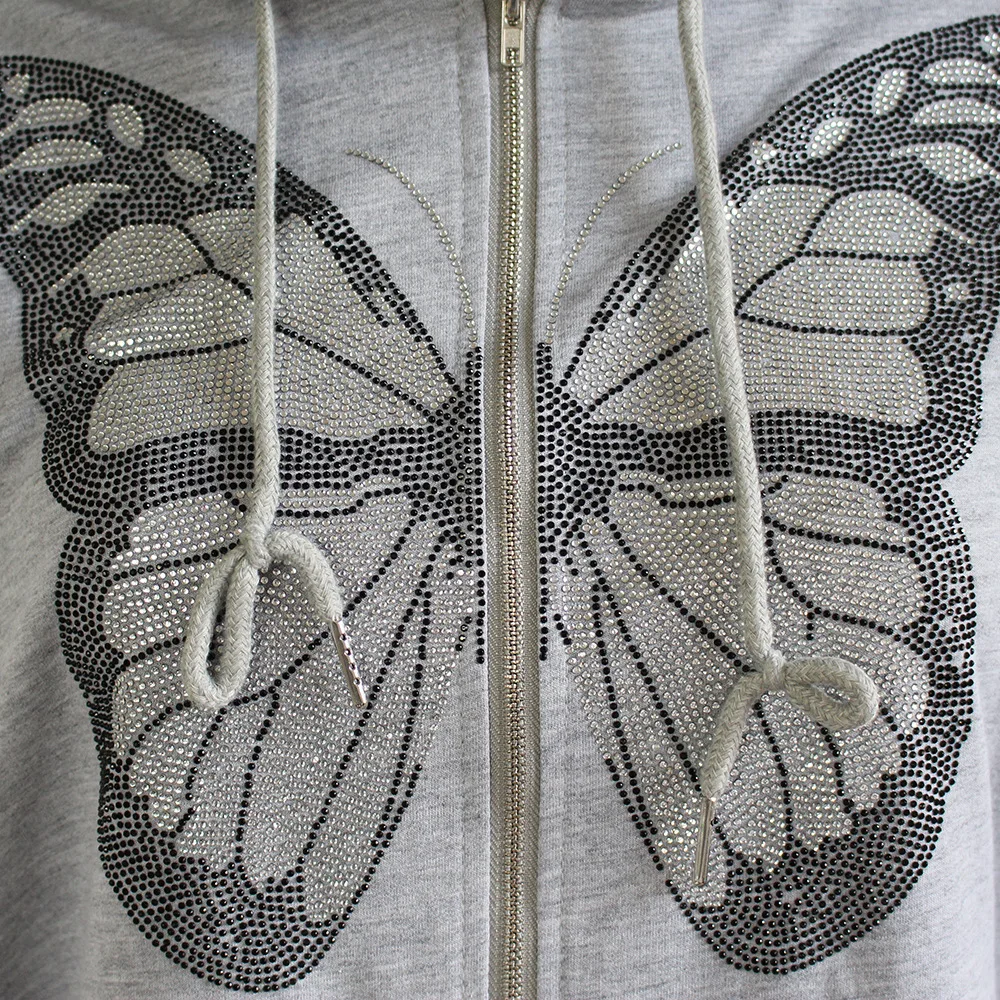 Y2K модные толстовки оверсайз с рисунком бабочки Стразы на молнии E-girl 90-е уличная одежда Алмазный серый длинный жакет осень 2021