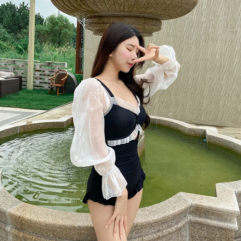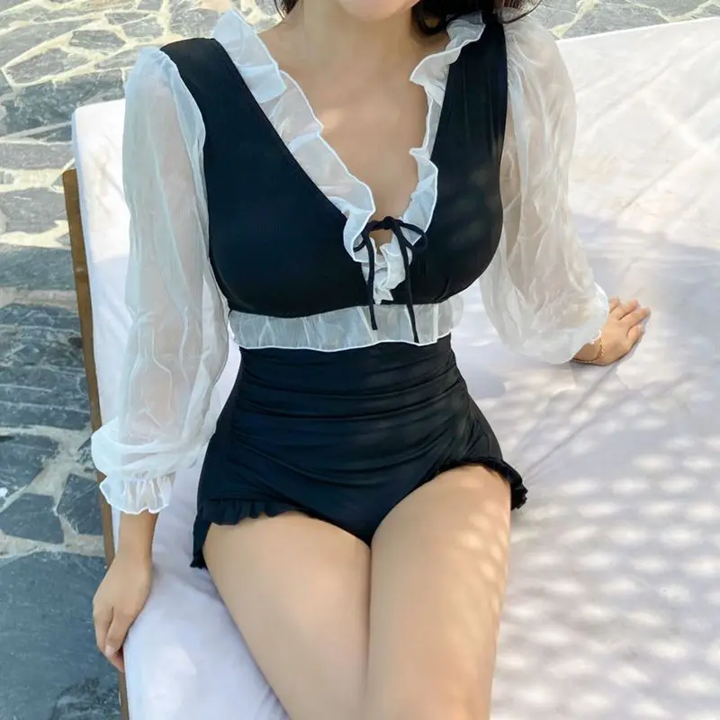 Женский купальный костюм, монокини, однотонный купальный костюм, летний праздничный цельный костюм с воланами и пуш-ап, одежда для плавания с длинным рукавом