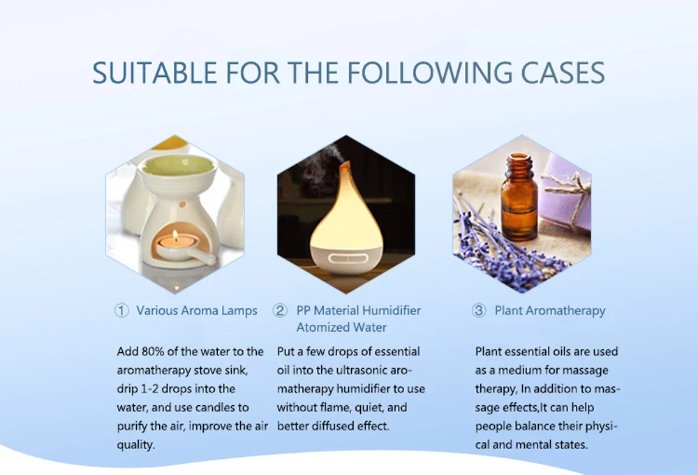 1. Различные Ароматические ЛампыДобавьте 80% воды в раковину печи для ароматерапии, капните 1-2 капли в воду и используйте свечи для очистки воздуха, улучшения качества воздуха.2. ПП Материал увлажнитель распыленной водыПоместите несколько капель эфирного масла в ультразвуковой увлажнитель для ароматерапии, чтобы использовать без пламени, тишины и лучшего диффузного эффекта.3. Ароматерапия растенийРастительные эфирные масла используются в качестве средства для массажной терапии, в дополнение к массажным эффектам, это может помочь людям сбалансировать их физическое и умственное состояние.