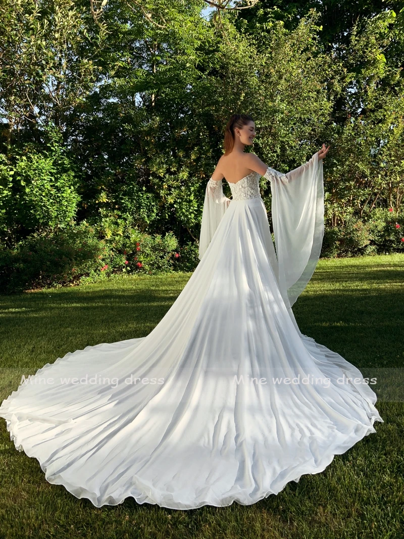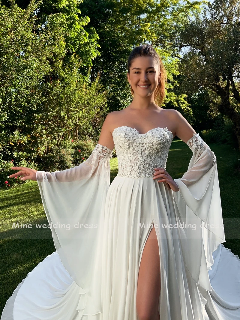 Шикарные пляжные шифоновые Свадебные платья 2021 трапециевидного силуэта, привлекательные кружевные женские платья со съемными рукавами и высоким разрезом