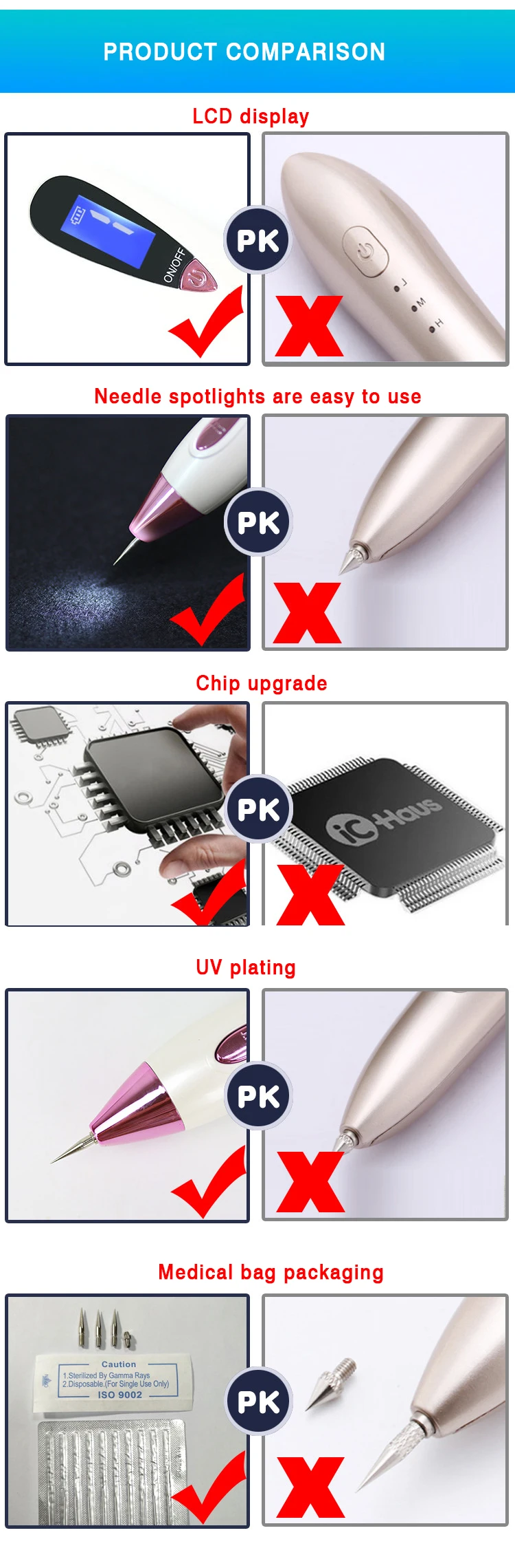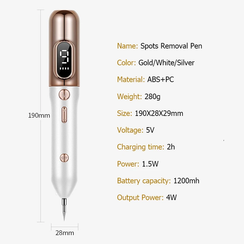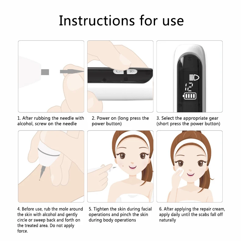 1. Используйте новейшие технологии, управление микрокомпьютером, безопасно, удобно и быстро.2. Он имеет 9 видов интенсивности для различных процедур. Нижний уровень используется на пятнах и веснушках. Сильный уровень используется на родинок и кожных бирках.3. Удалите Пятно без крови.4. Точечная ручка из нержавеющей стали не токсична, гигиенична, не ржавеет для безопасного использования.5. ЖК-дисплей показывает, сколько электричества и уровня интенсивности.6. Заряжайте напрямую с помощью USB линии, легко носить с собой и легко управлять. Аккумулятор большой емкости.