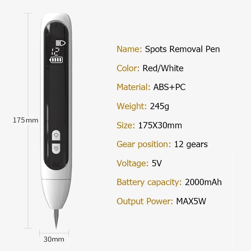 1. Используйте новейшие технологии, управление микрокомпьютером, безопасно, удобно и быстро.2. Он имеет 12 видов интенсивности для различных процедур. Нижний уровень используется на пятнах и веснушках. Сильный уровень используется на родинок и кожных бирках.3. Удалите Пятно без крови.Точечная ручка из нержавеющей стали Нетоксичная, Гигиеничная, непростая в ржавчине для безопасного использования.4. ЖК-дисплей показывает, сколько электричества и уровня интенсивности.5. Заряжайте напрямую через usb-кабель, легко носить с собой и легко управлять. Аккумулятор большой емкости.