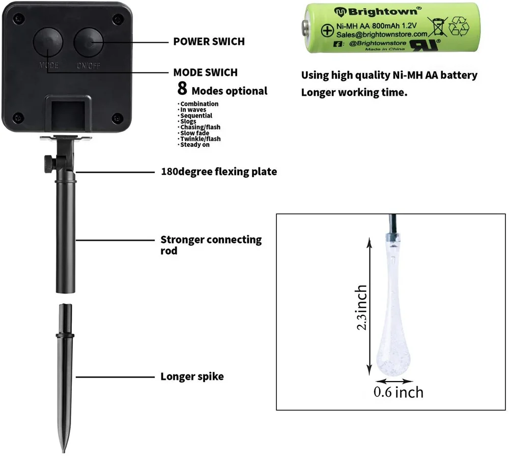 Материал: пластикПереключатель: вкл/выкл, режимВремя зарядки/работы: 6-8 / 8-12 часовАккумулятор: 1,2 в маСолнечная панель: 2 в, маСрок службы: около 50000 часовКачество воды: 20 светодиодов/30 светодиодовДлина провода: 4 м/6 м Инструкции по установке продукта:Откройте коробку, удалите все аксессуары.Соедините Две стойки вместе.Выньте солнечную панель; Найдите слот, который вы хотите установить;Затем вставьте стент в паз.Отрегулируйте угол. Затяните винты. Снимите защитную пленку на солнечной панели.Нажмите кнопку ВКЛ/ВЫКЛ, чтобы включить его, и он обычно работает. Вы также можете изменить режим вспышки с помощью кнопки mode. Посылка1x20/30 светодиодных уличных садовых фонарей на солнечных батареях1 солнечная панель1 заземляющий шип