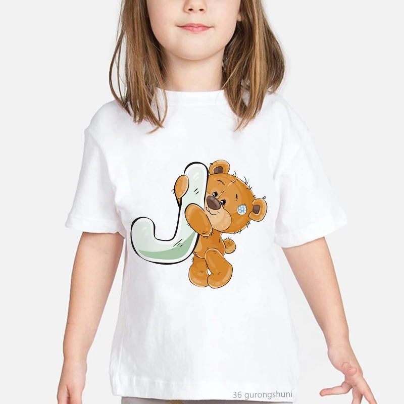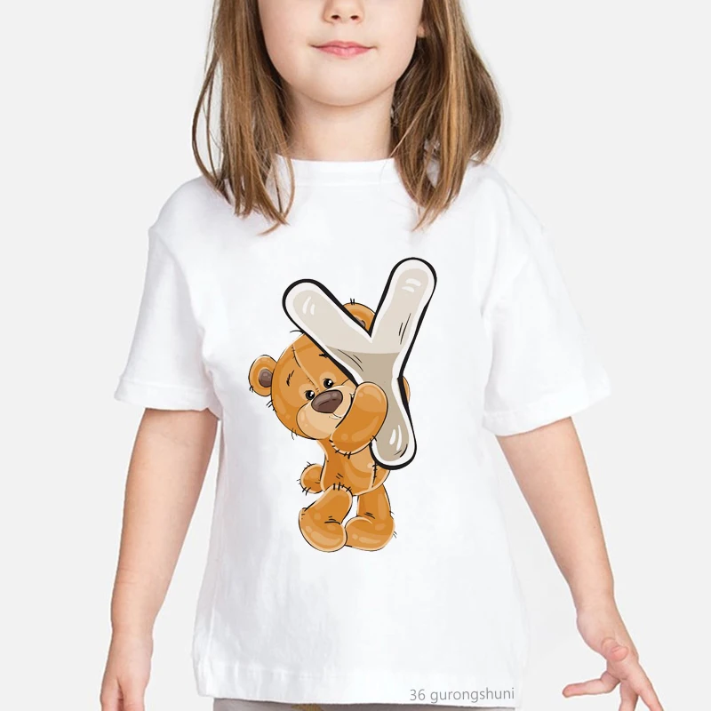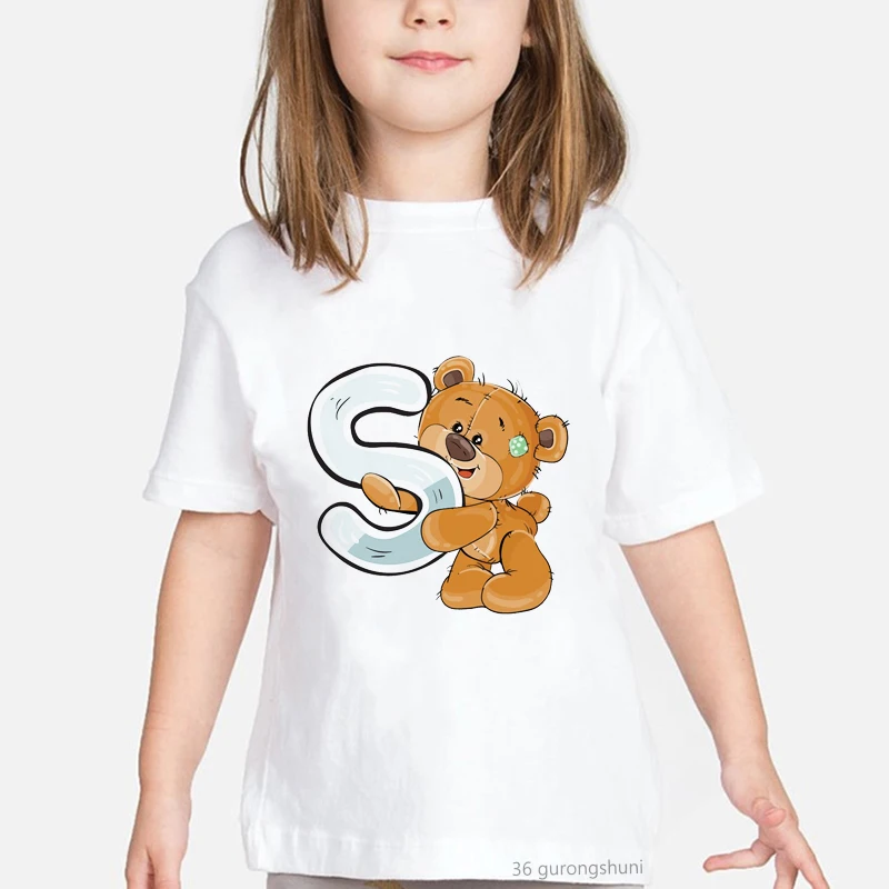Новинка, футболка для мальчиков и девочек с забавным медведемалфавитом, детская одежда, летние модные милые футболки для девочек с алфавитом из мультфильма, костюм на день рождения