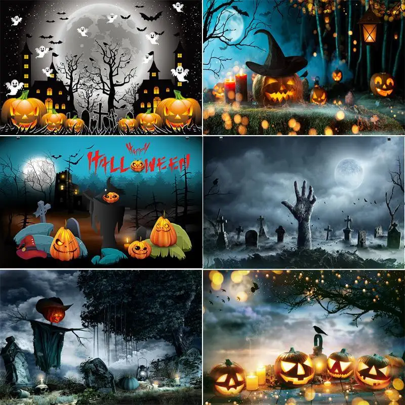 Фон для детских фотографий на день рождения, Хэллоуин, надгробный камень, замок, тыква, фонарь, луна, летучая мышь