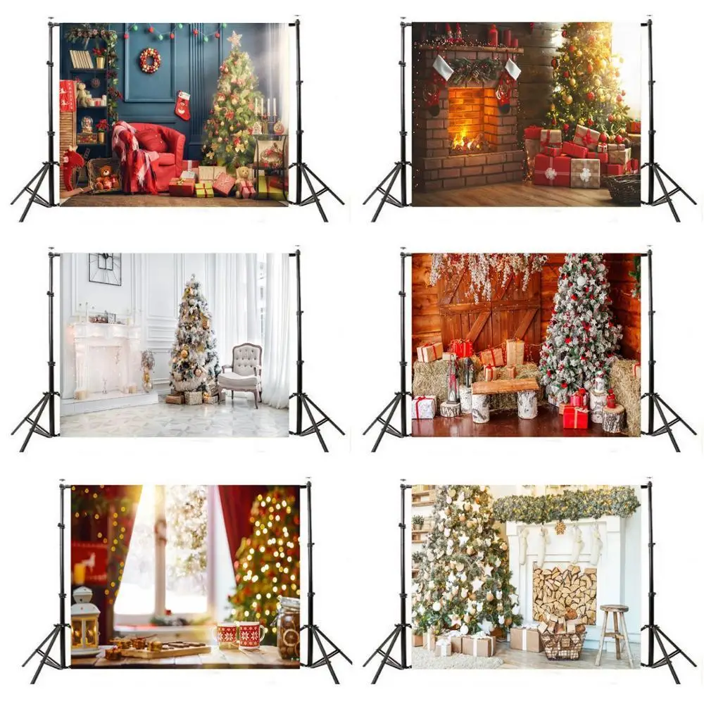 Фон для фотосъемки с изображением рождественской елки камина подарочной коробки деревянного пола