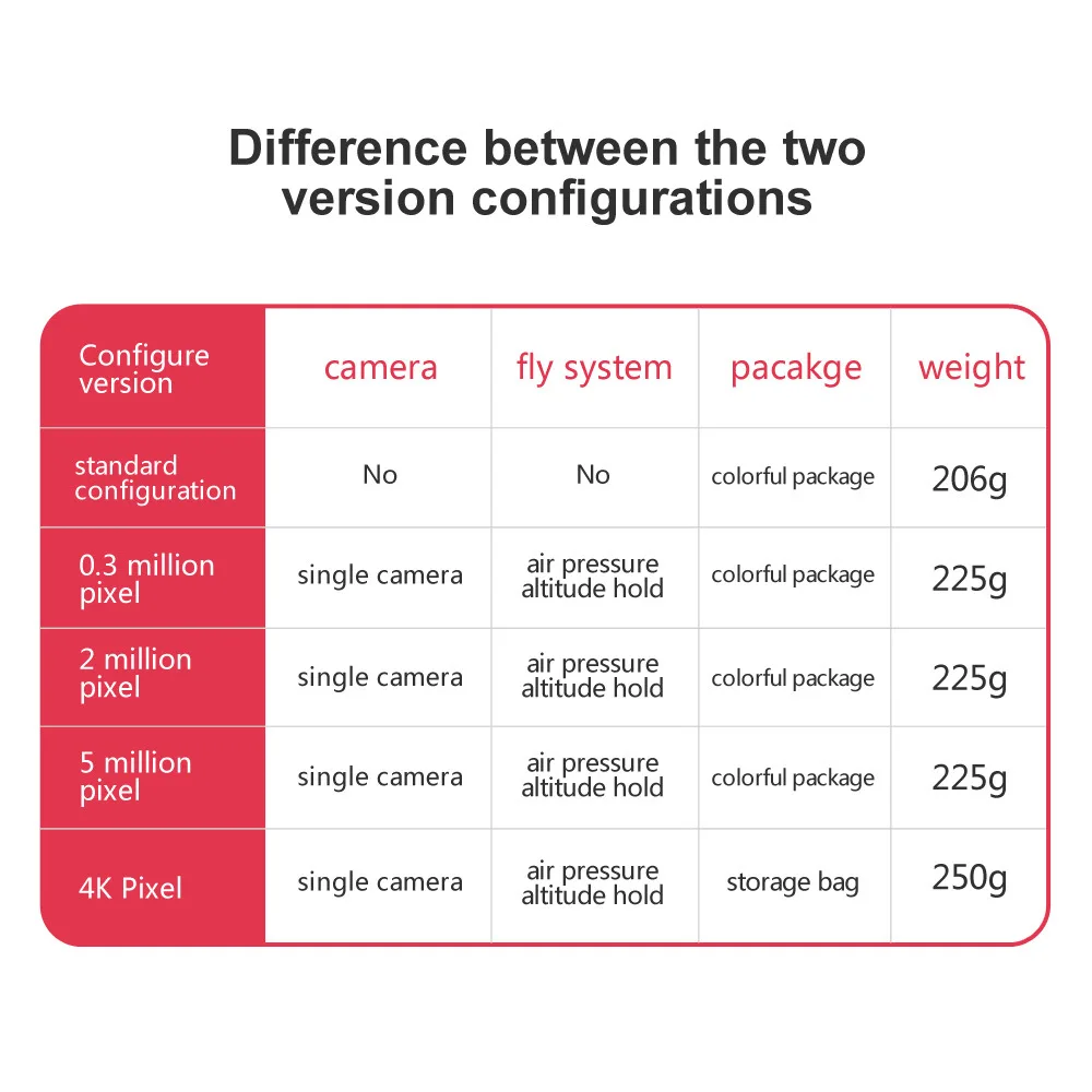 Характеристика: -С функцией удержания высоты обеспечивает стабильный полет. -С функцией Wi-Fi можно подключать приложение, систему APK для съемки, видео, передачу в режиме реального времени через Изображение камеры телефона. -Есть 4 камеры на выбор. С широкоугольной камерой 0.3MP 2.0MP 5.0MP 4K обеспечивает широкий диапазон изображения и видео с высоким разрешением. -С привлекательным безголовым режимом, полностью решая проблемы «потери ориентации». -2,4 GHz управления по радио, легкая регулировка частоты -6-осевой гироскоп сильная стабильность, легко выполняйте различные маневры в воздухе, сильное сопротивление ветра, легче контролировать -360 ° 3D Flips (непрерывный рулон) -Летают как внутри, так и снаружи -Есть 5 вариантов на выбор. Основная версия-без камеры, 0.3MP камера, 2,0 МП камера, 5.0MP 4KMP,