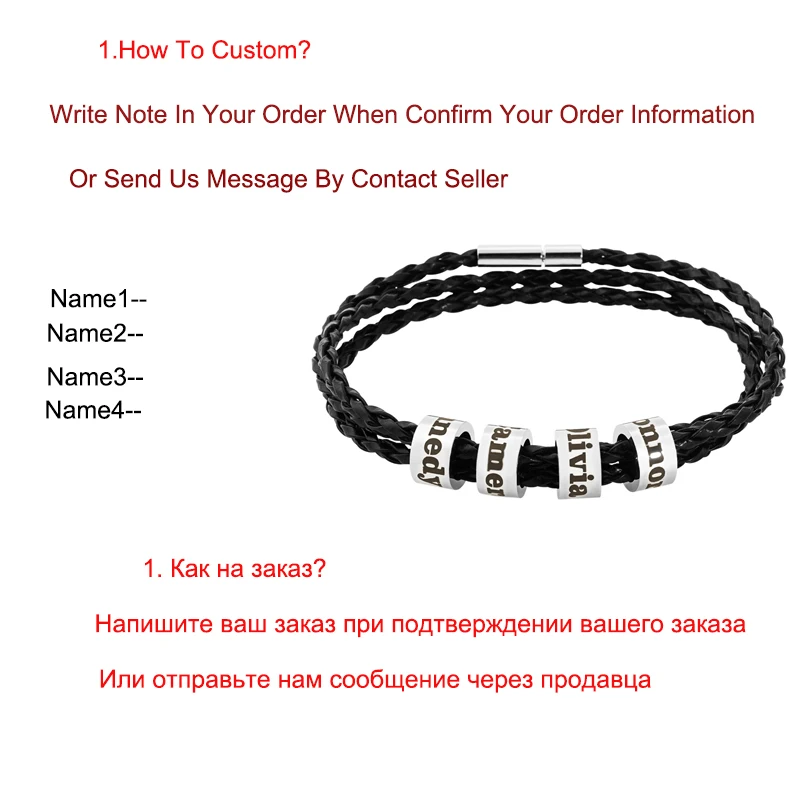 О заказе:Пожалуйста, оставьте индивидуальную информацию (имена или слова) в сообщении при размещении заказа или свяжитесь с продавцом.Пример пользовательского имени: Джеймс, Питер, Олива, пол, ДавидВыберите 1-9 бусин, в каждой по 15 символов.Размеры:Товар: браслет с именем из бусин на заказМатериал: натуральная кожаМеталл бусин: нержавеющая стальШирина бусин: 6 ммПряжка: магнитная пряжкаВремя обработки:Все товары изготавливаются по заказу и требуются 1-2 рабочих дня для рукоделия.
