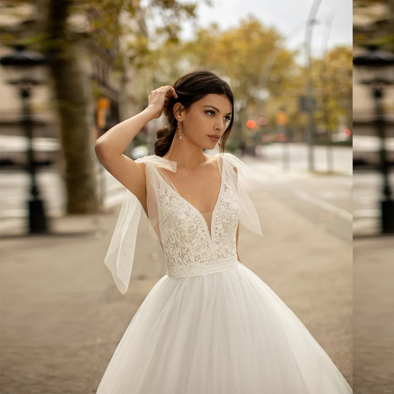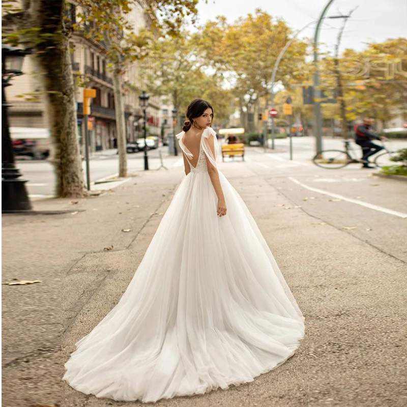 Женское свадебное платье с V-образным вырезом, кружевное фатиновое платье принцессы с открытой спиной и аппликацией, свадебное платье на заказ