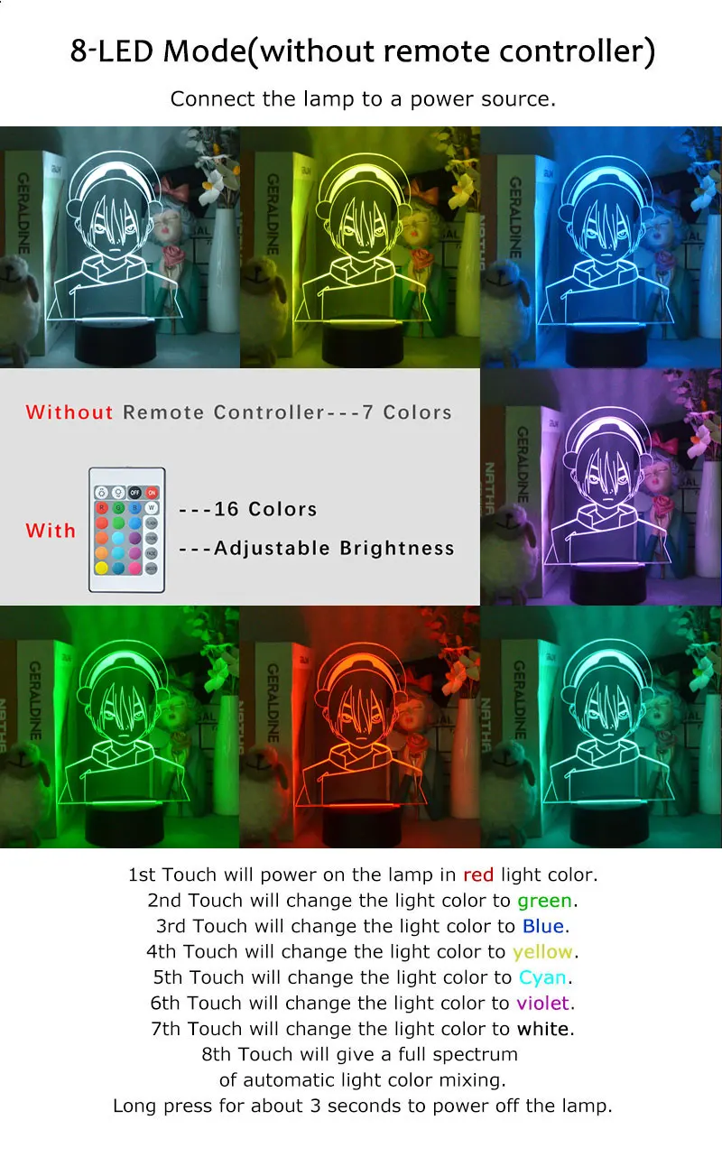 Это удивительный художественный декор для украшения спальни. Лампы высотой около 20 см и могут осветить ваше пространство 7 разными цветами (красный, желтый, зеленый, голубой, синий, фиолетовый, белый) и множеством различных оттенков. Каждая лампа поставляется с твердым полимерным основанием, в котором находятся батареи 3AA и usb-кабели и в 2 различных видах-твердая черная/трещина лава. Вы получите то, что выберете. Основание черной лампы: только восходящее освещение, и он выделит векторный график. Основание лампы лавы: светильник излучает все направления и дает кристально чистый светильник. 7 цветов без пульта дистанционного управления: Если вы минималистичный и предпочитаете Базовые цвета, вы можете выбрать наш сенсорный вариант, в котором вы можете изменить цвет одним касанием на основе. 16 цветов с пультом дистанционного управления: Чтобы выбрать больше цветов и режимов освещения, вы можете перейти к нашему удаленному типу. С помощью пульта дистанционного управления вы можете легко переключать цвета, регулировать яркость, оттенки, а также иметь другие варианты, такие как позволяет цветам выцветать друг в друга и контролировать скорость цветовых переключателей, если вы хотите. Наши 3D лампы с лазерной гравировкой делают идеальный подарок на Рождество, день рождения, новый год или дом теплым для ваших друзей аниме-ботаников! Обязательно оставьте нам отзыв о Вашем товаре и не стесняйтесь обращаться к нам по любым вопросам с вашим заказом! Обратите внимание: ● Перед вставкой в основание снимите защитную пленку с поверхности как спереди, так и сзади. ● Чтобы не оставлять отпечатков пальцев на акриле, удерживайте доску на кромке, а не на поверхности.