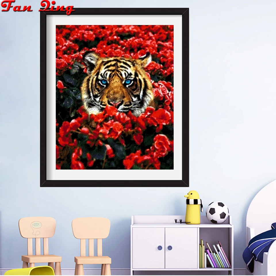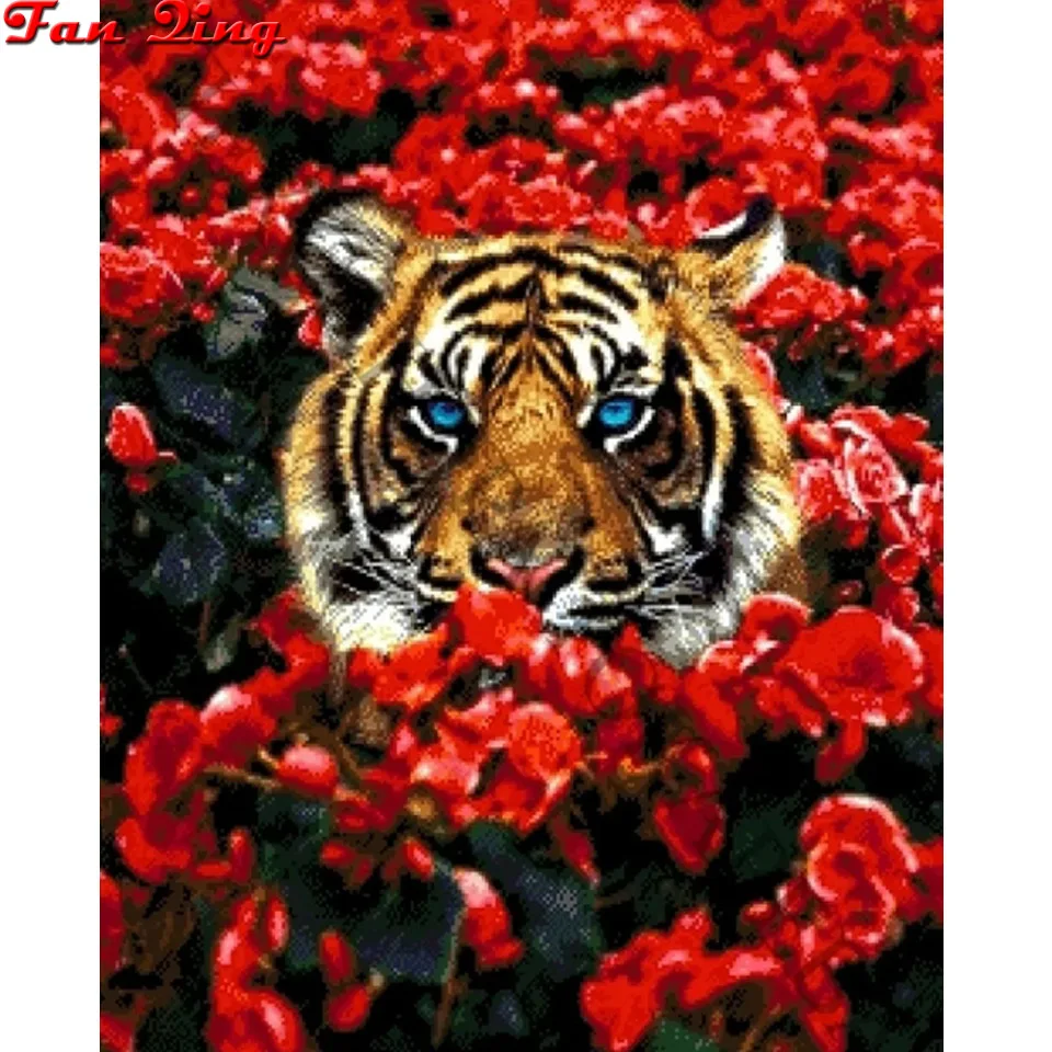 Алмазная картина, красные цветы и тигр, полная круглая дрель, стразы, алмазная вышивка, животные, мозаичные комплекты, украшение для дома