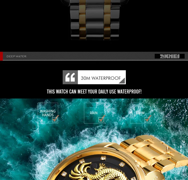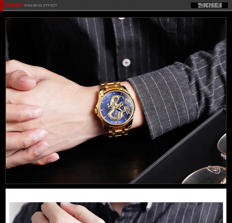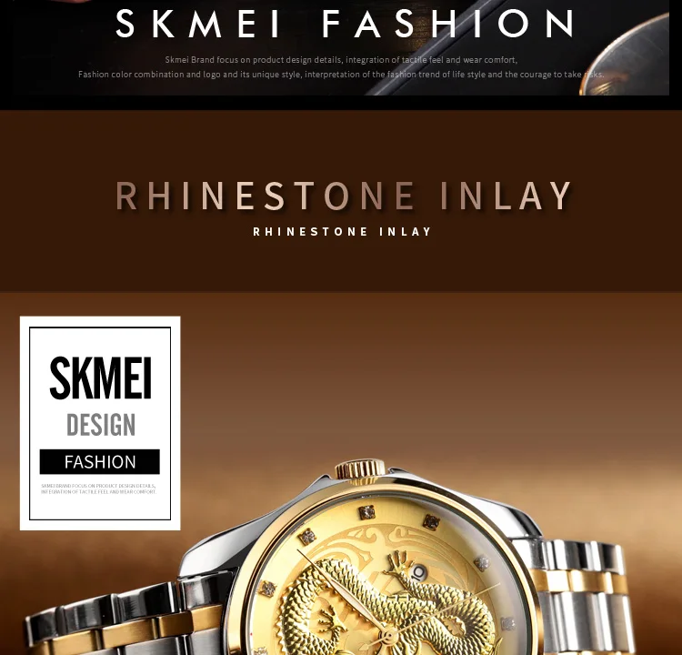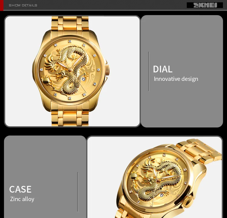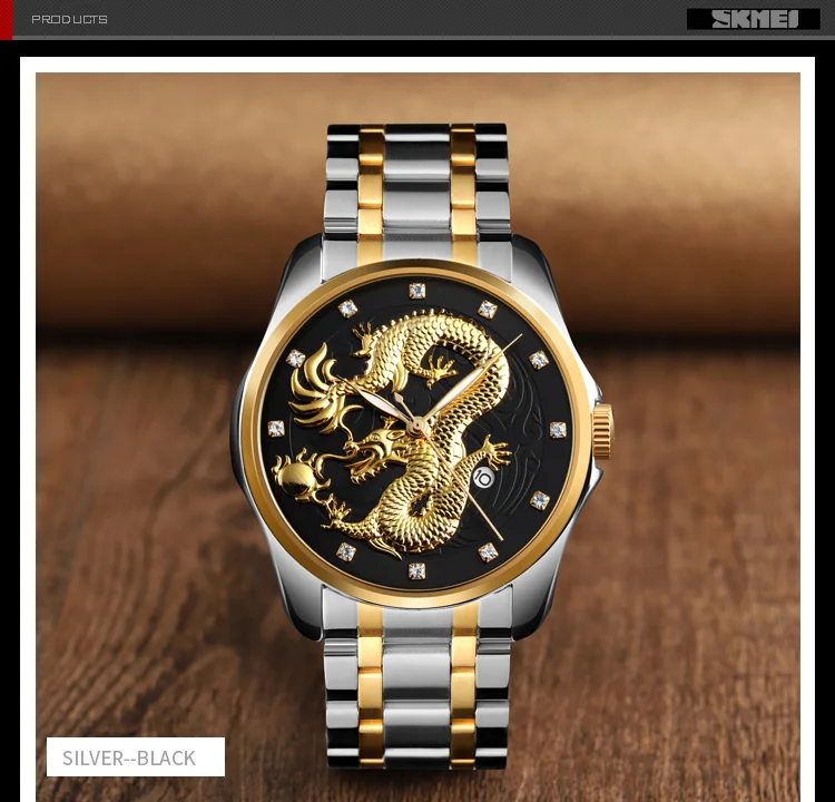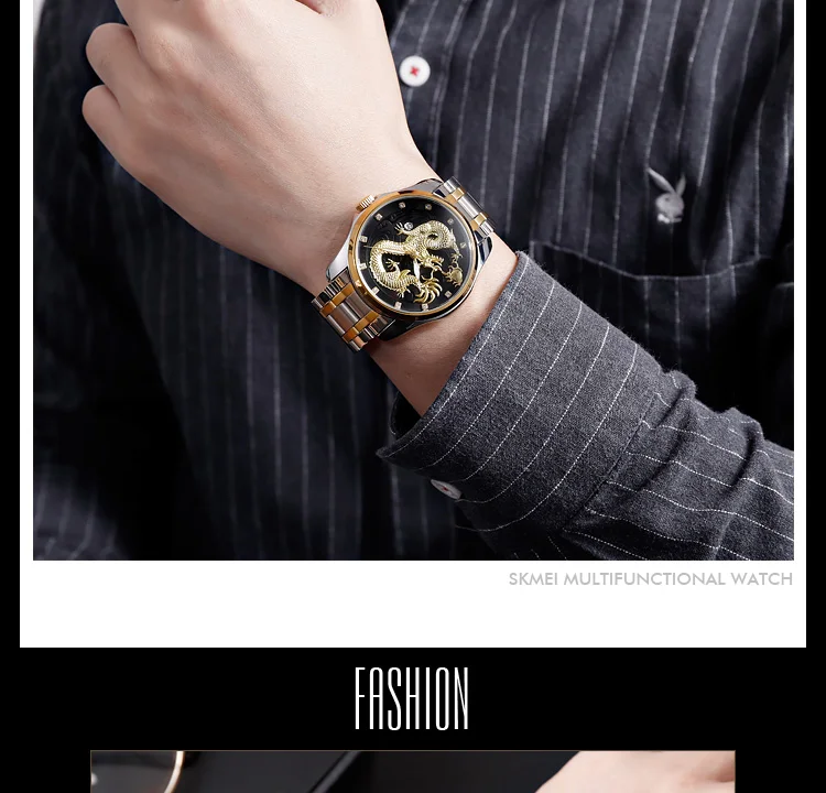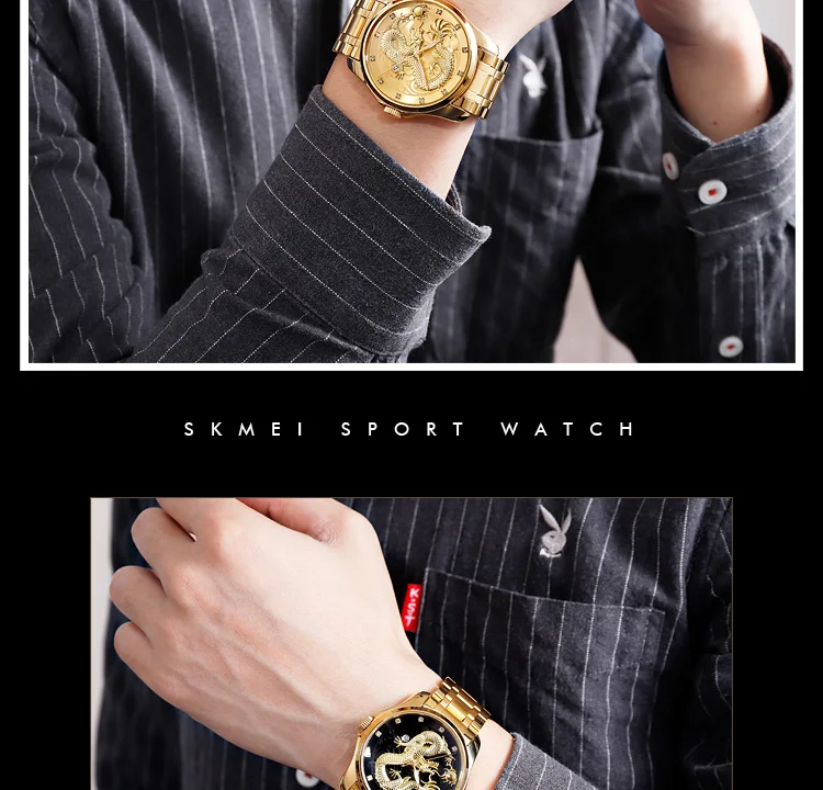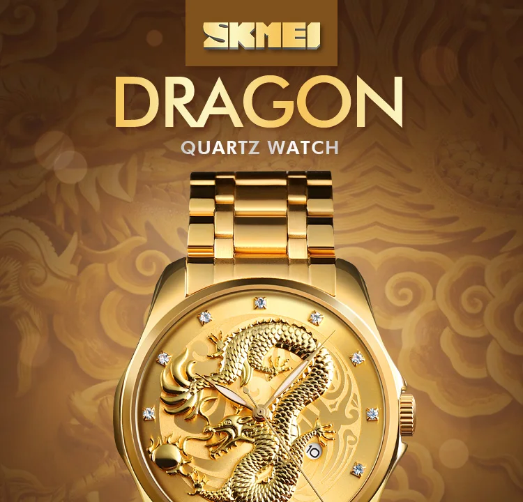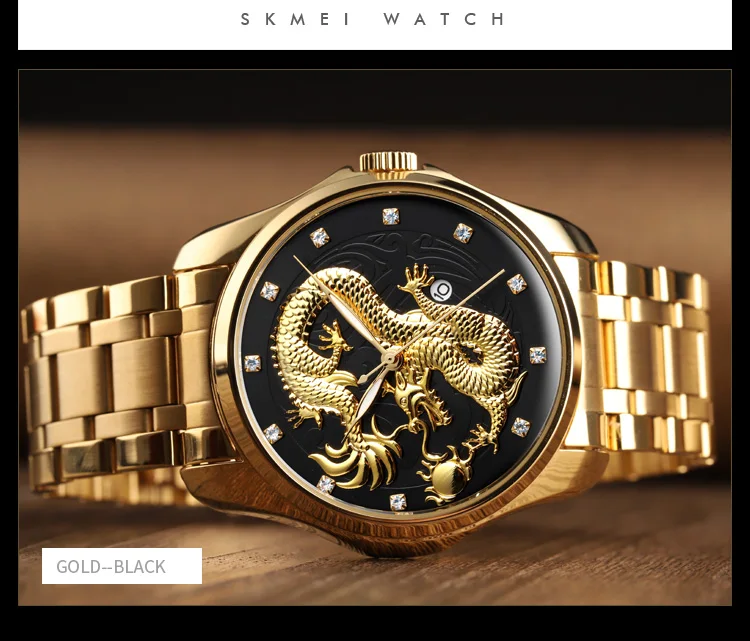 Часы наручные SKMEI Мужские кварцевые, брендовые Роскошные водонепроницаемые с золотистым драконом, с отображением даты, с браслетом из нержавеющей стали