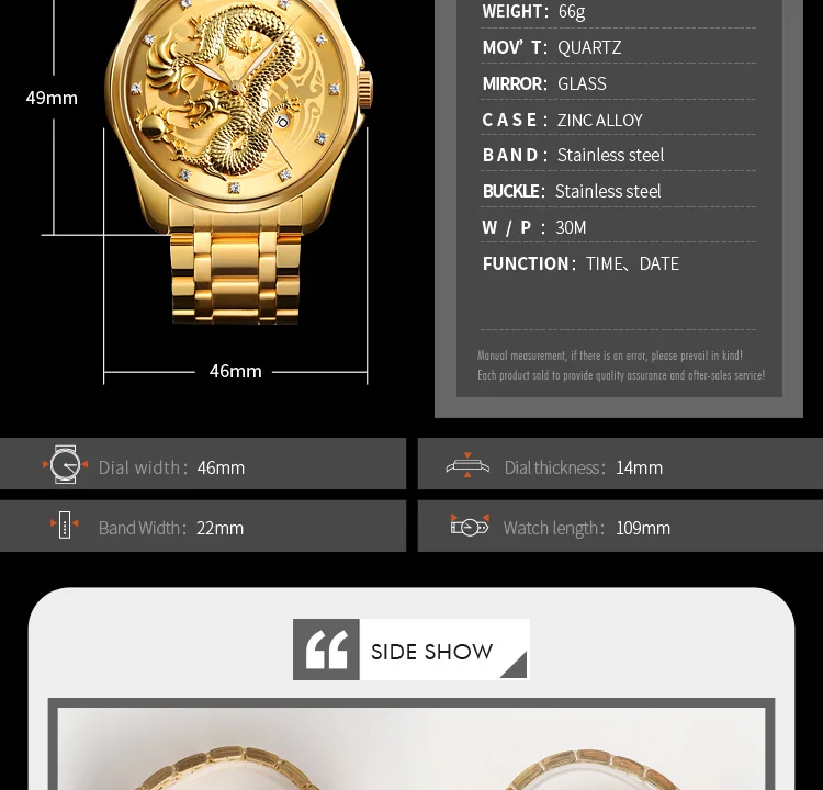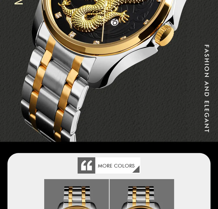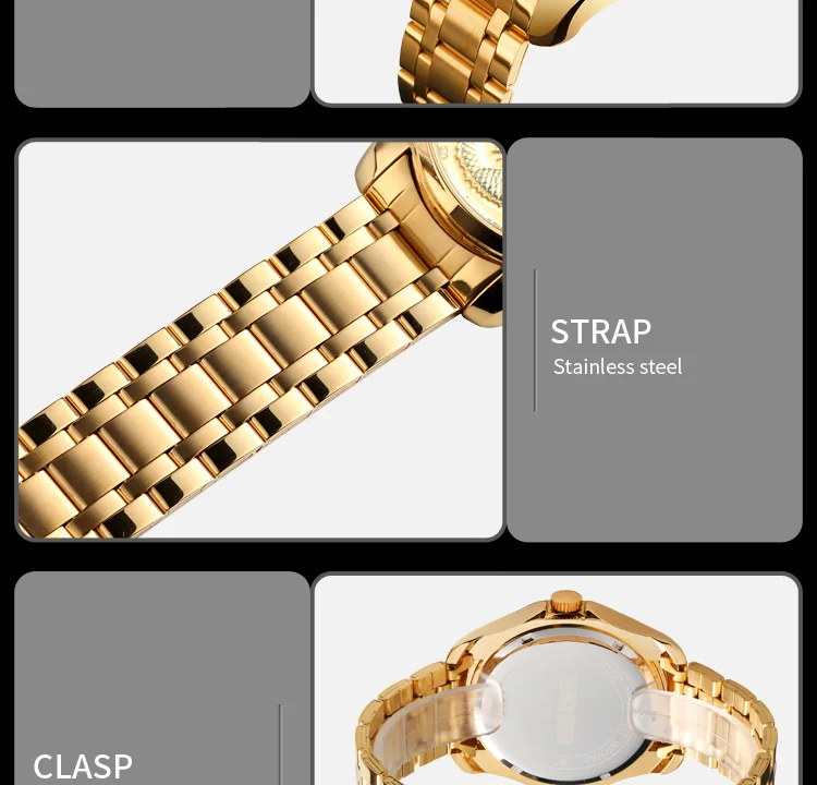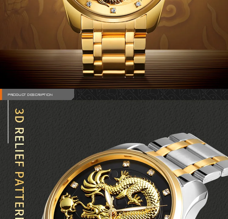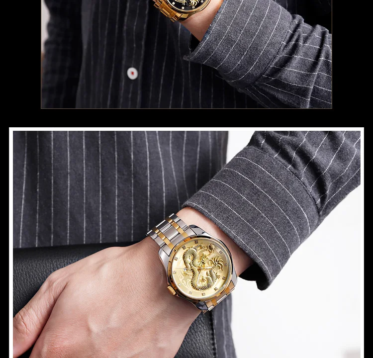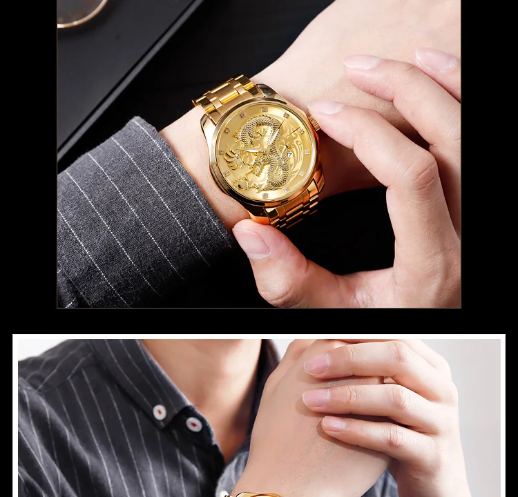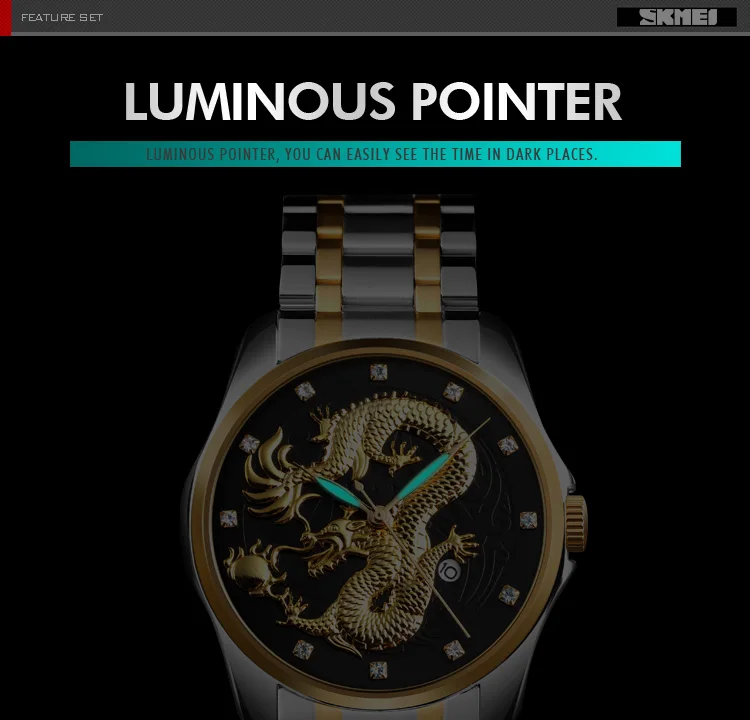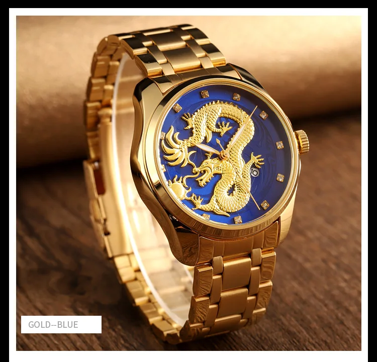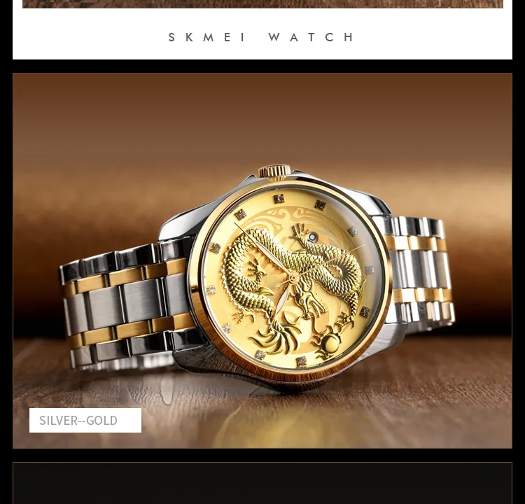 Часы наручные SKMEI Мужские кварцевые, брендовые Роскошные водонепроницаемые с золотистым драконом, с отображением даты, с браслетом из нержавеющей стали