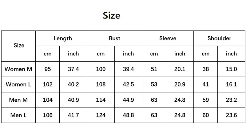 Материал: 100% хлопок Размер: M, L Женский M: обхват груди: 100 см, длина: 95 см, рукав: 51 см, ширина плеч: 38 см Размер L: обхват груди: 108 см, длина: 102 см, длина рукава: 53 см, ширина плеч: 41 см Мужская M: обхват груди: 114 см, длина: 104 см, длина рукава: 63 см, ширина плеч: 59 см L: обхват груди: 124 см, длина: 106 см, длина рукава: 63 см, ширина плеч: 60 см Цвет: как на фотографии Сезон: весна, лето, осень Повод: для дома Посылка включает в себя: 1 Пижама Полезные советы: из-за того, что в светильник экране монитора фактический цвет возможна небольшая разница в цвете из-быть s светильник ly отличается из-за характеристик монитора компьютера. Просим сделать припуск 1–3 см на ручное измерение.