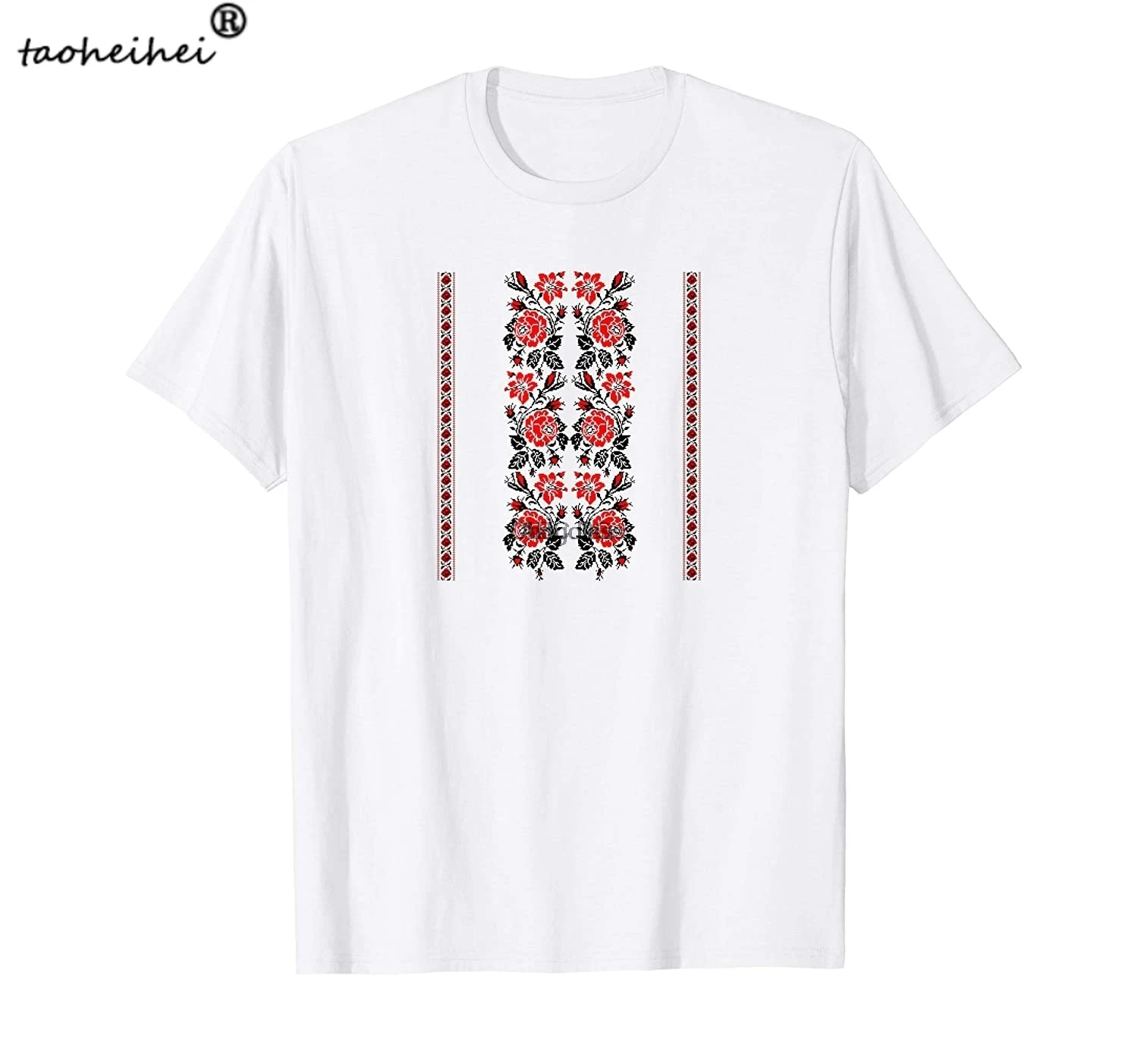 Футболка с вышитыми красными и черными цветами в украинском национальном стиле