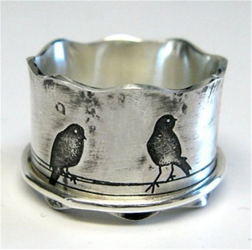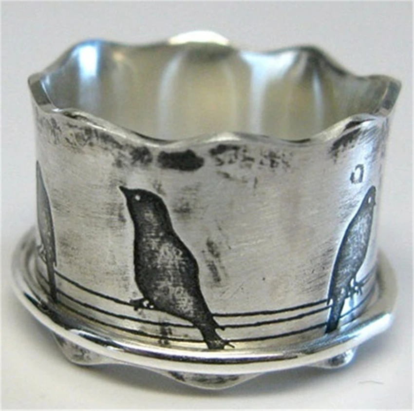 Старинное серебряное кольцо черного цвета с лазерной гравировкой, узор в виде чашки, узор в виде птиц, мелохоли, готический дизайн