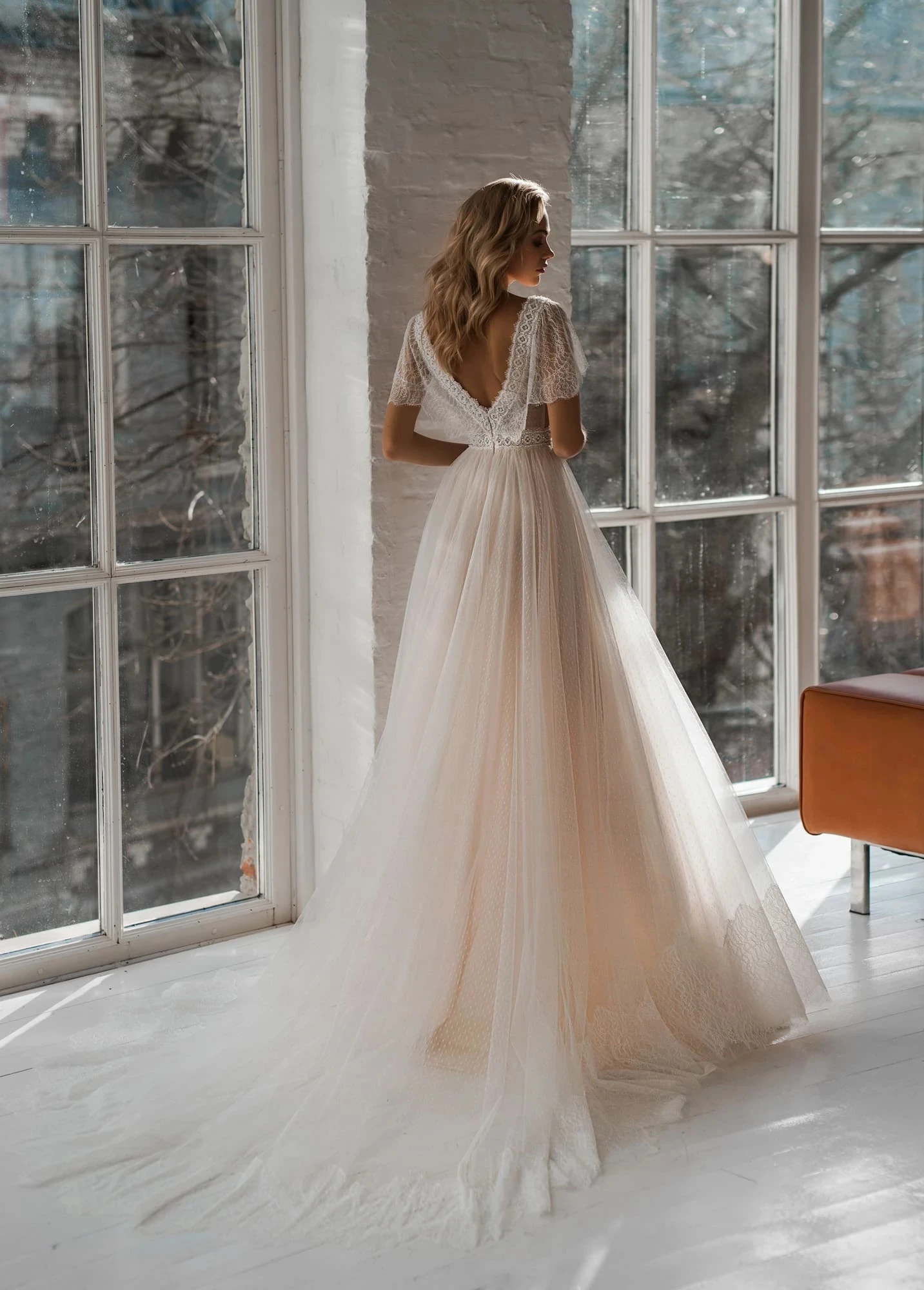 Свадебные платья LORIE с коротким рукавом в стиле бохо 2021, кружевные аппликации в горошек, блестящие платья с глубоким V-образным вырезом и открытой спиной для пляжа и свадьбы