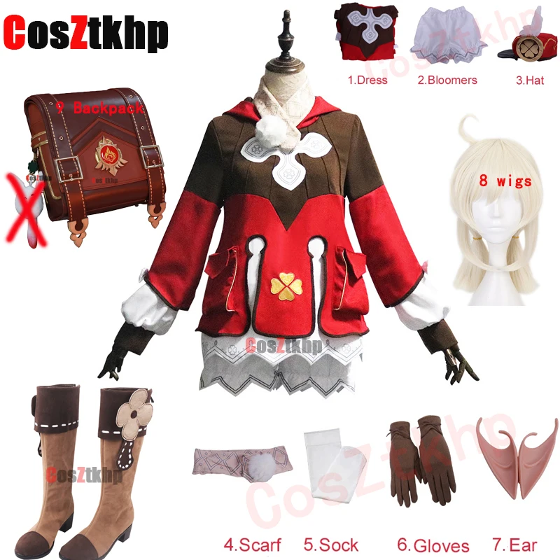 Комплект костюмов для косплея Genshin Impact Klee из 9 предметов, обувь, рюкзак, лоли, вечерняя одежда, Униформа, женские карнавальные костюмы, полный комплект