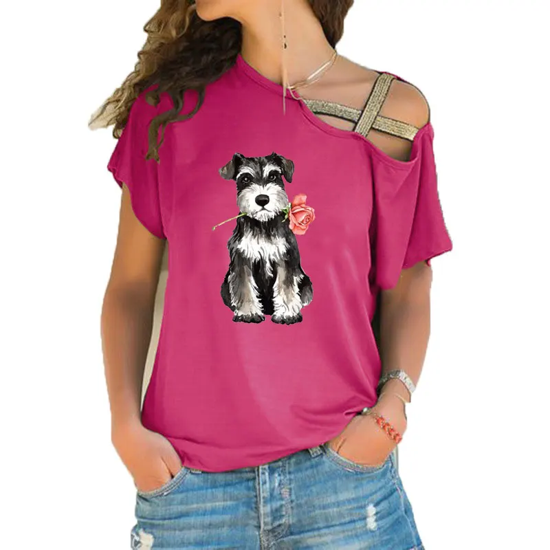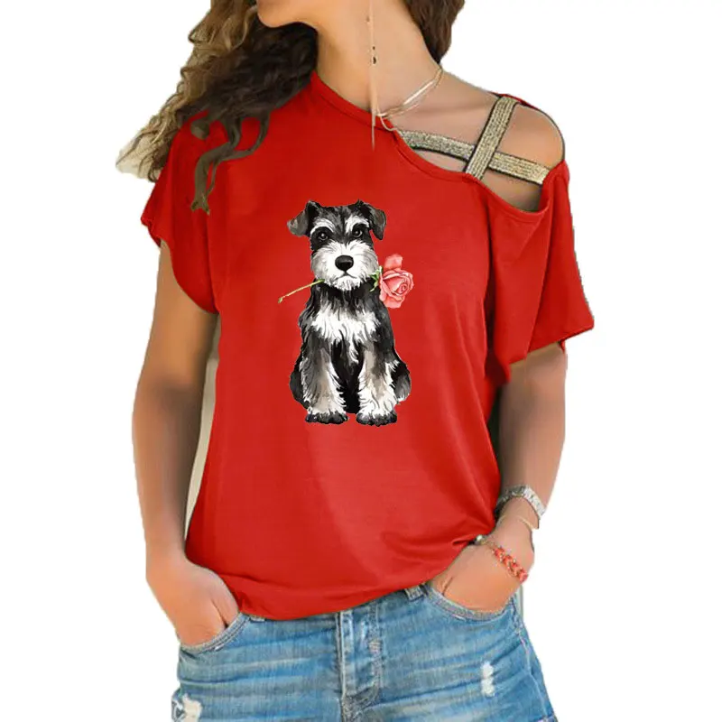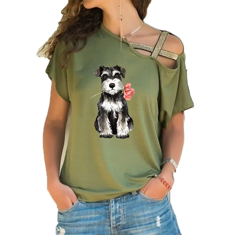 Женская футболка с коротким рукавом, Свободный Асимметричный топ с принтом шнауцера, ассиметричная повязка с перекрестными лямками, лето