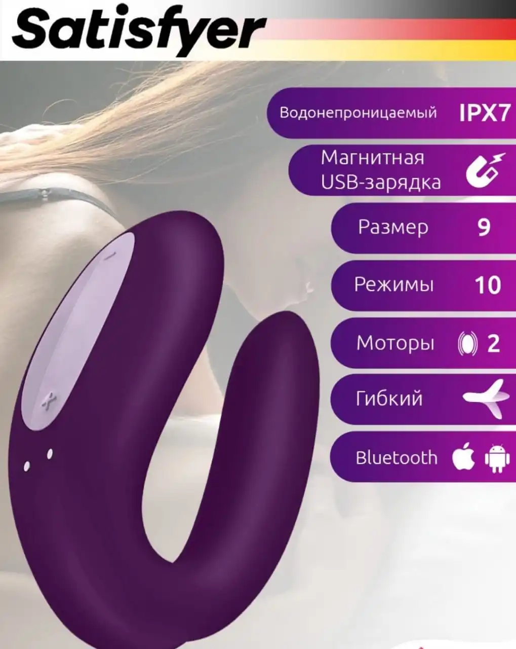 Благодаря эргономичному дизайну Satisfyer Double Joy имеетU-образную форму, плотно прилегающую к интимным зонам и обеспечивающуюинтенсивную вибрацию. Он имеет два мотора по одному в каждом конце, один изкоторых предназначен для стимуляции влагалища, второй для стимуляции клитора.Изготовленный из медицинского силикона стимулятор обладает гладкой, приятной наощупь поверхностью. Применение Особенность игрушки состоит в том, что онауправляется не только с помощью кнопок на корпусе, но и с помощью телефона.Новое приложение Satisfyer Connect предлагает вам уникальные возможности. Оносовместимо с любым Android или Apple, смартфоном, планшетом и Apple Watch.Дистанционное управление позволит наслаждаться не только стандартнымипрограммами, но и эксклюзивными функциями по созданию своих режимов вибрации.Дополнительно в приложении есть опция, при использовании микрофона мобильноготелефона можно делать преобразование окружающих звуков в вибрацию. Игрушкатакже вибрирует под музыку. Рекомендуется использовать совместно слубрикантом(смазкой). Товар упакован в черный пакет или коробку, на упаковке иэтикетке нет названия товара. Оператор в пункте выдачи не знает о содержимомзаказа.