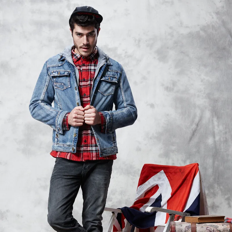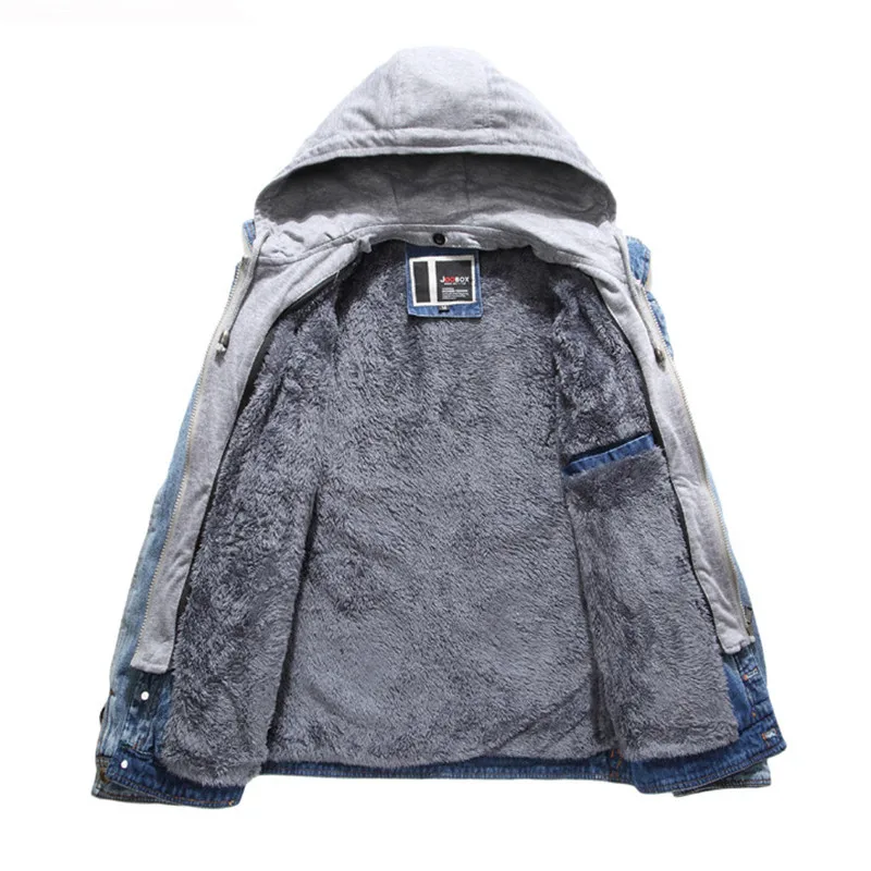 Куртка джинсовая мужская, на флисовой подкладке, со съемным капюшоном, синего цвета