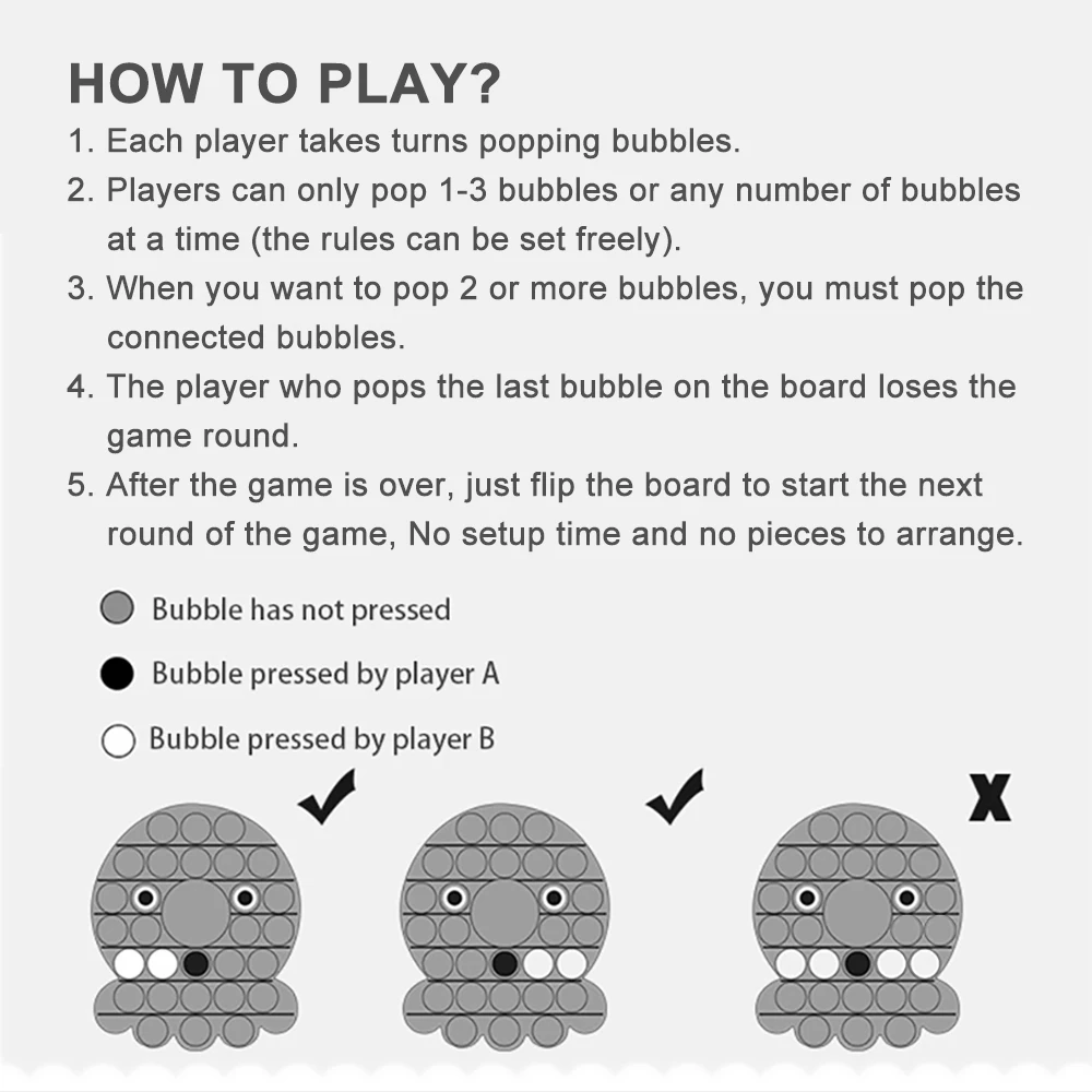 Проигрыватели по очереди нажимают пузырьки. Каждый игрок может одновременно нажимать 1-3 пузыря и каждый раз нажимать подключенные пузыри. Если игрок не может нажать на пузырь, это означает, что игрок потерялся. Вы также можете настроить правила игры в соответствии с ситуацией. После того, как игрушка перевернута, можно играть в следующий раунд игры.