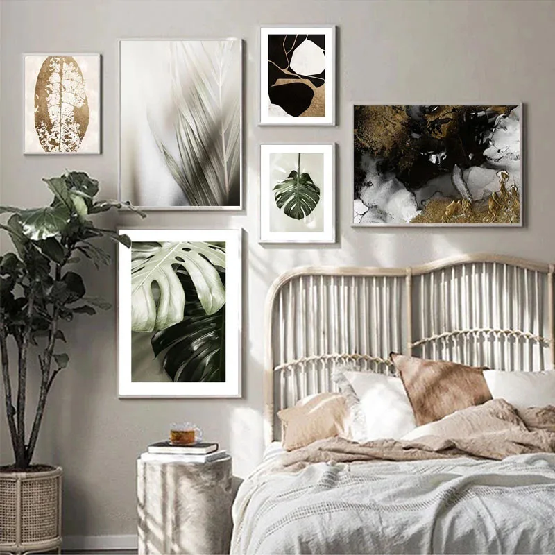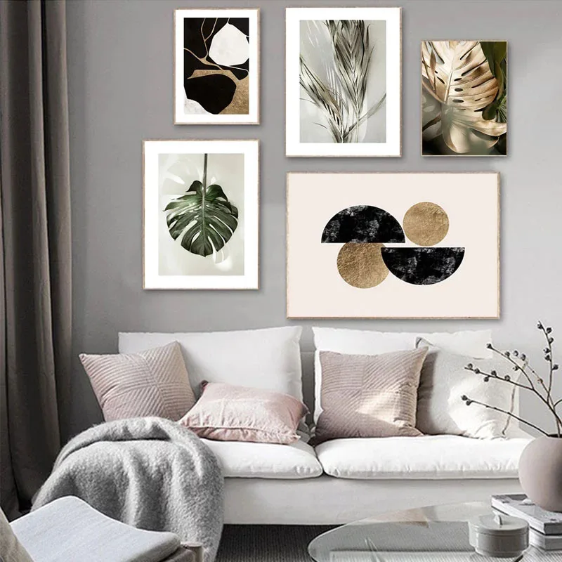 Картина на холсте с зелеными и золотыми листьями, скандинавский пос...