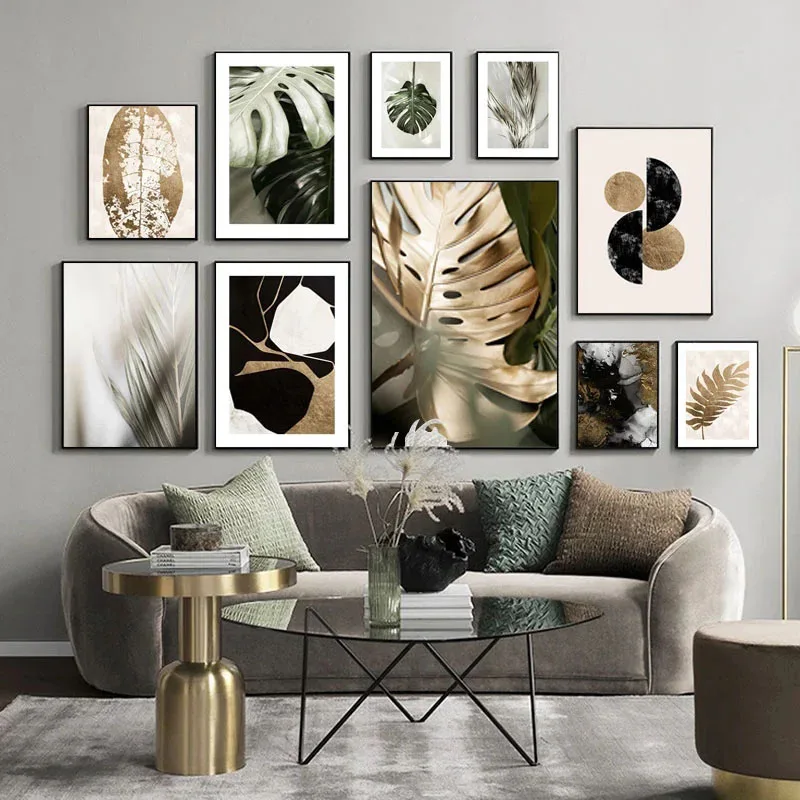 Картина на холсте с зелеными и золотыми листьями в скандинавском ст...