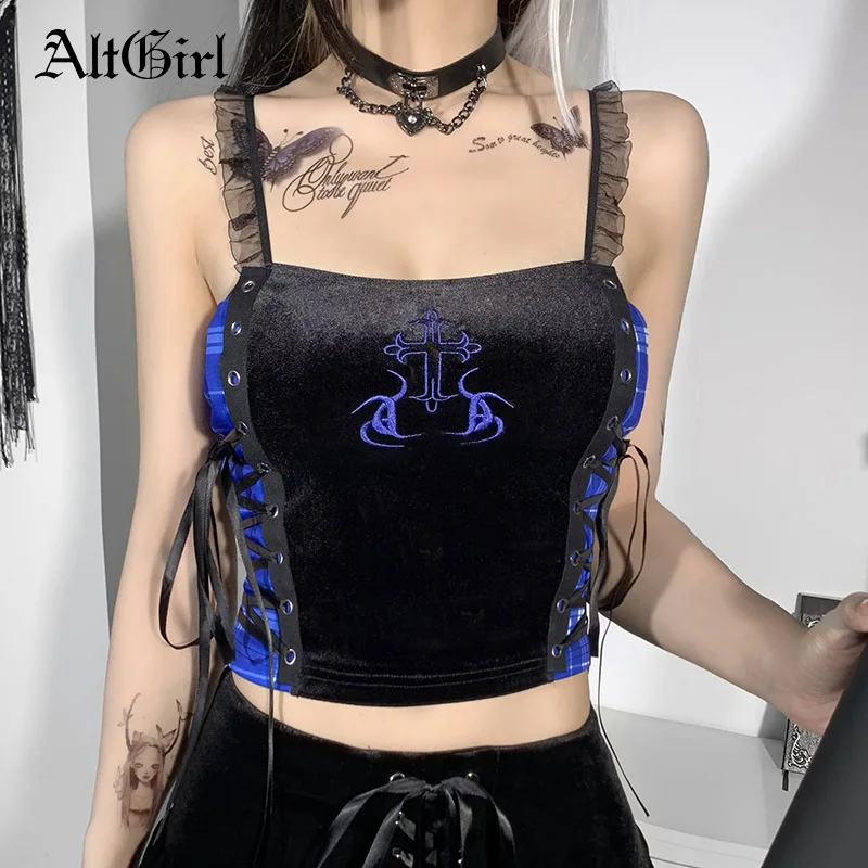 Женский бархатный топик AltGirl Y2k, готический топик в стиле панк, темный академический центр, эмо, УКОРОЧЕННЫЙ ТОПИК в клетку, с завязками, без бретелек