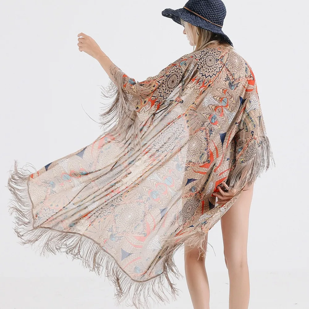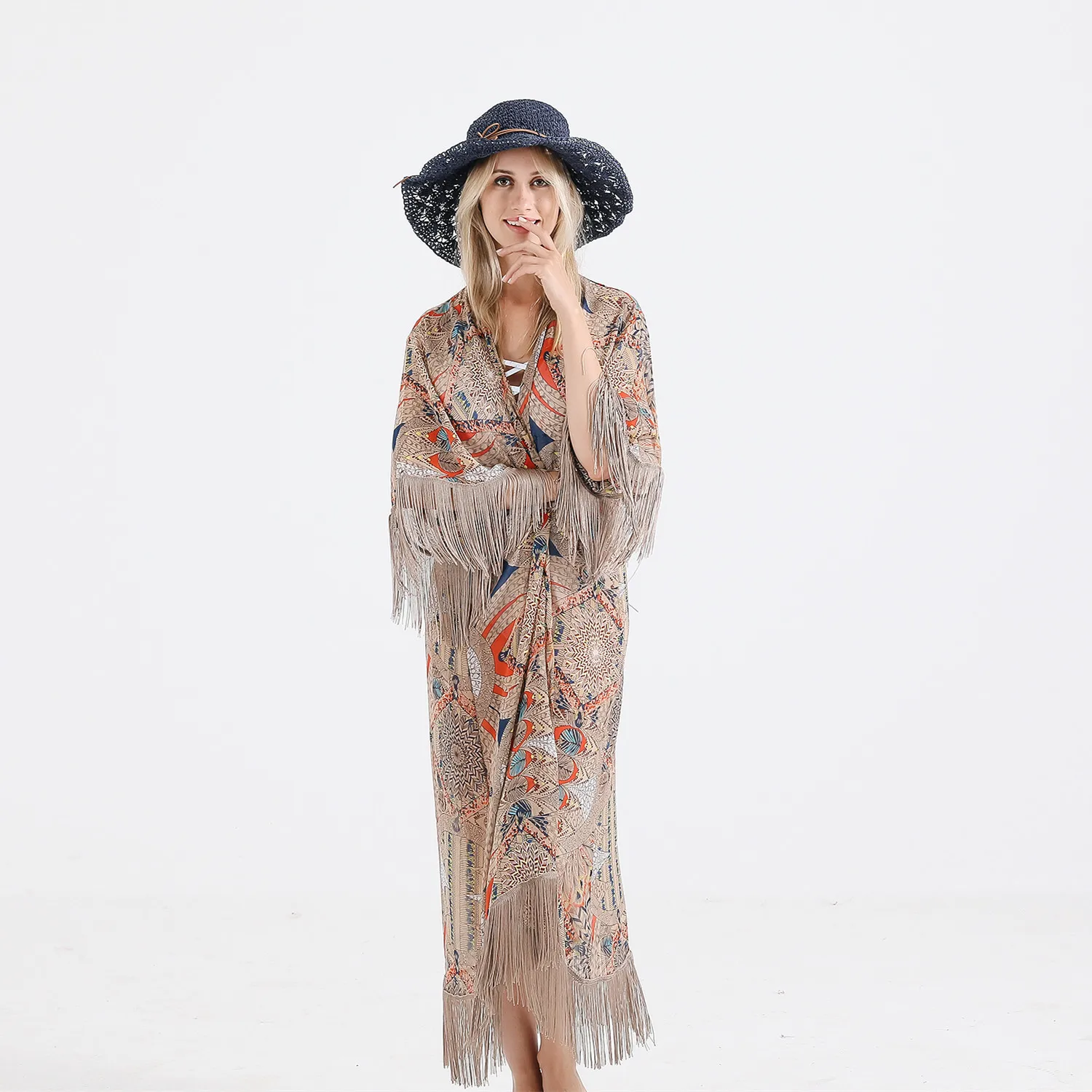 Женское шифоновое пляжное кимоно с принтом, длинный кардиган с шаль...