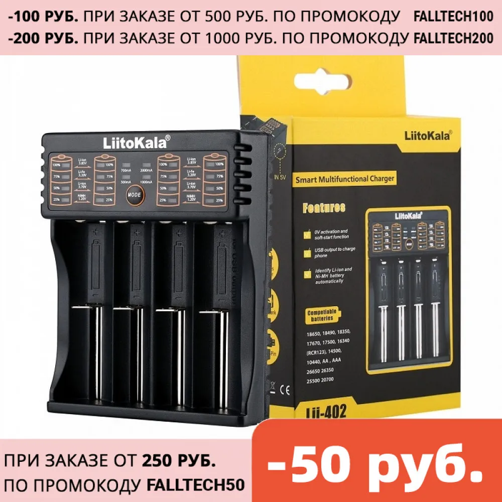 LiitoKala Lii-402 - универсальное интеллектуальное зарядное устройство, совместимое практически со всеми цилиндрическими аккумуляторами, тем самым устраняющее необходимость использования нескольких зарядных устройств. Lii-402 автоматически распознает литий-ионные, никель-металлгидридные и никель-кадмиевые аккумуляторы, заряжает литий-фосфатные (LiFePO4) аккумуляторы, а так же Li-ION аккумуляторы с конечным напряжением 4,35в.
