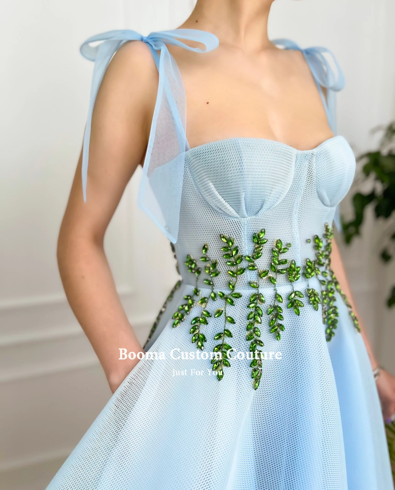 Детское платье на выпускной Booma, голубое Сетчатое платье из тюля, ТРАПЕЦИЕВИДНОЕ ПЛАТЬЕ на бретельках с бантом, с кристаллами и зелеными листьями для свадебной вечеринки
