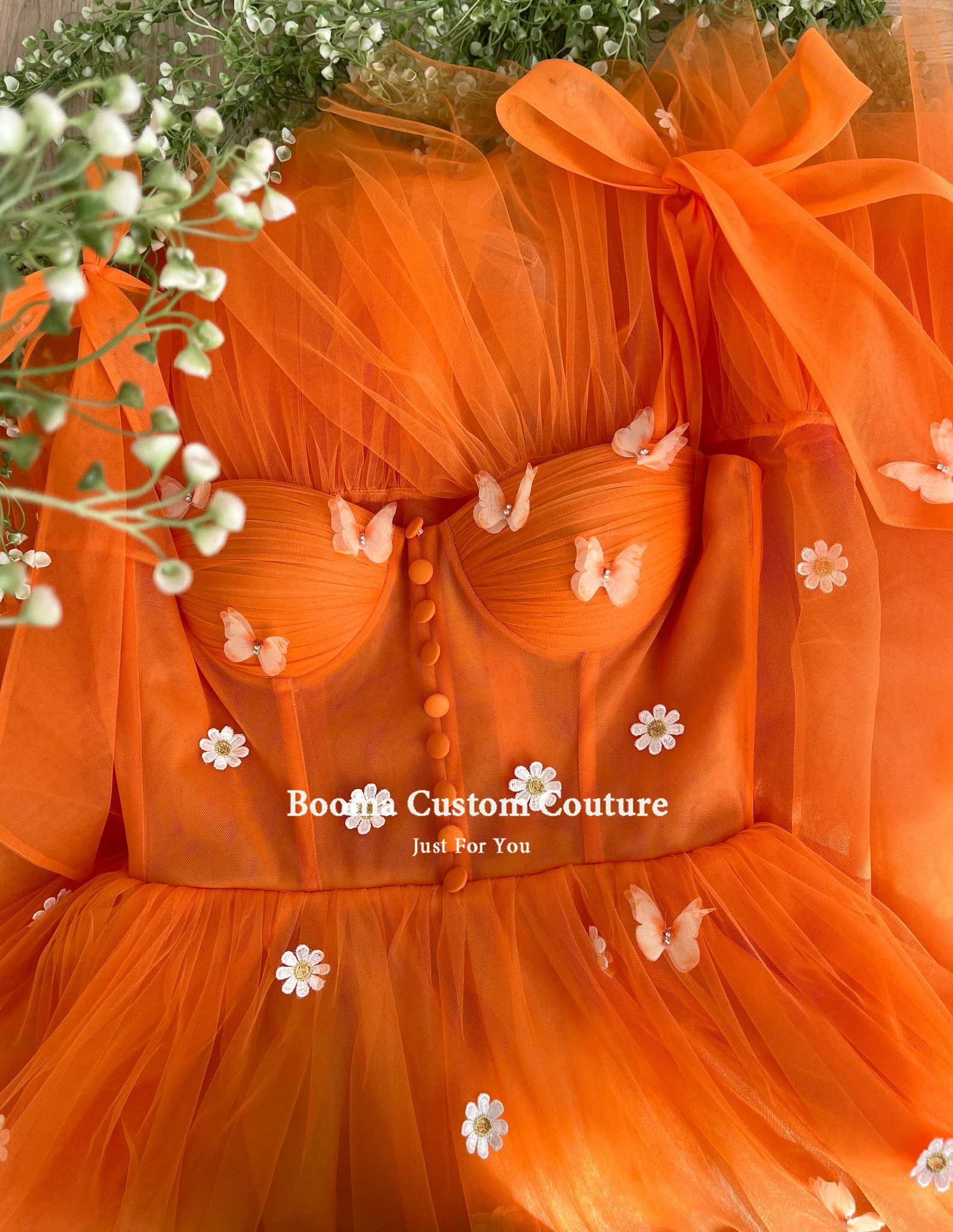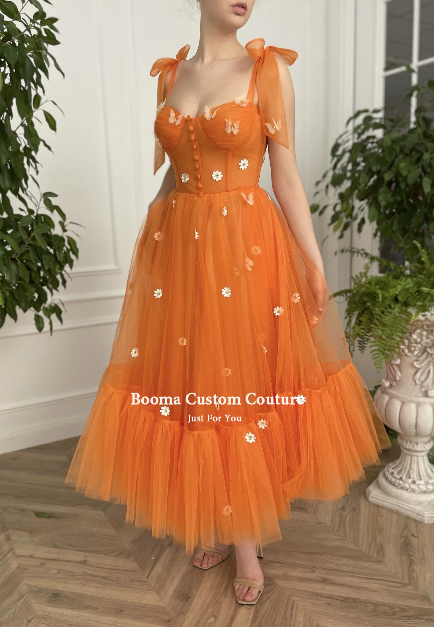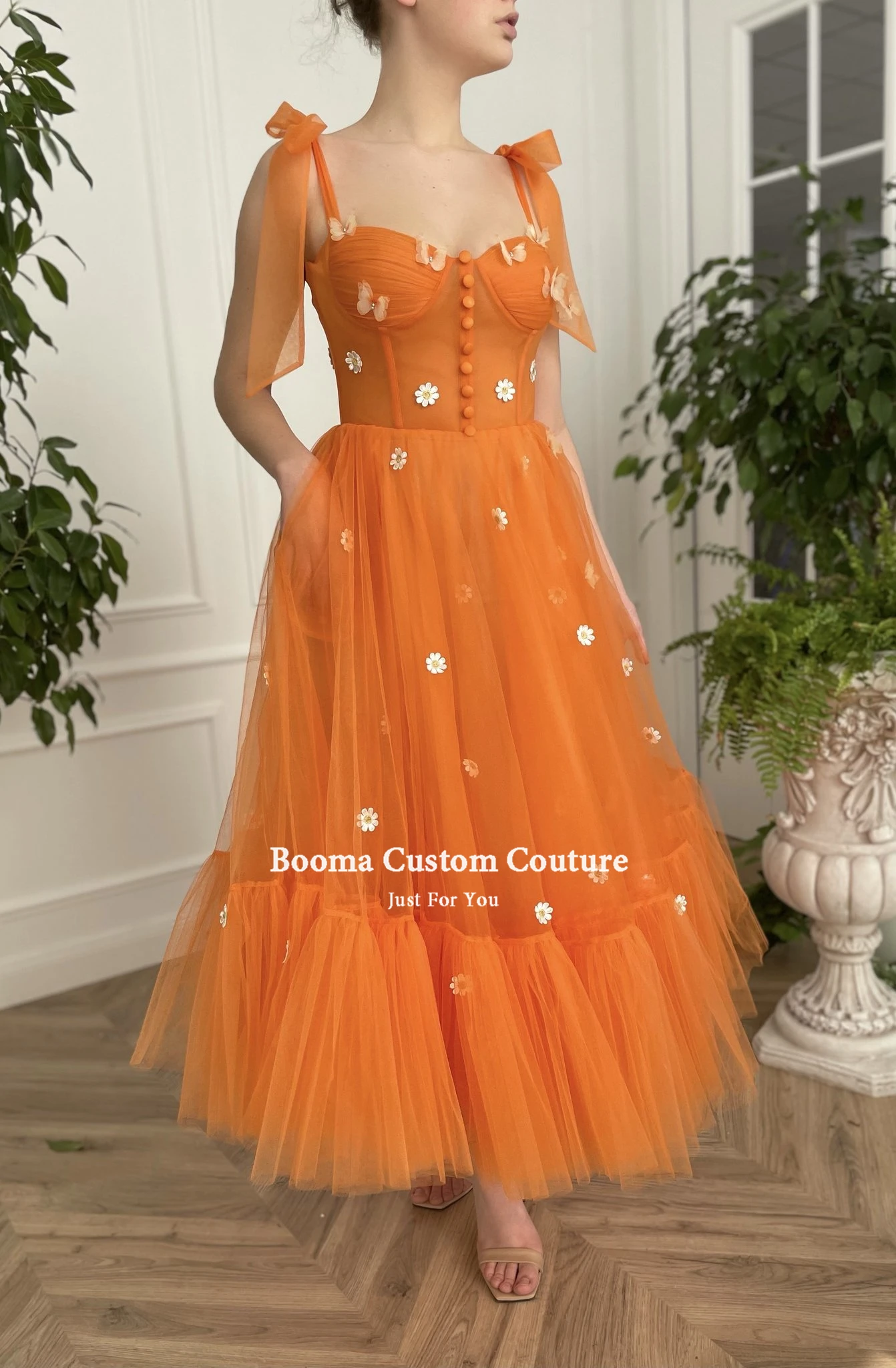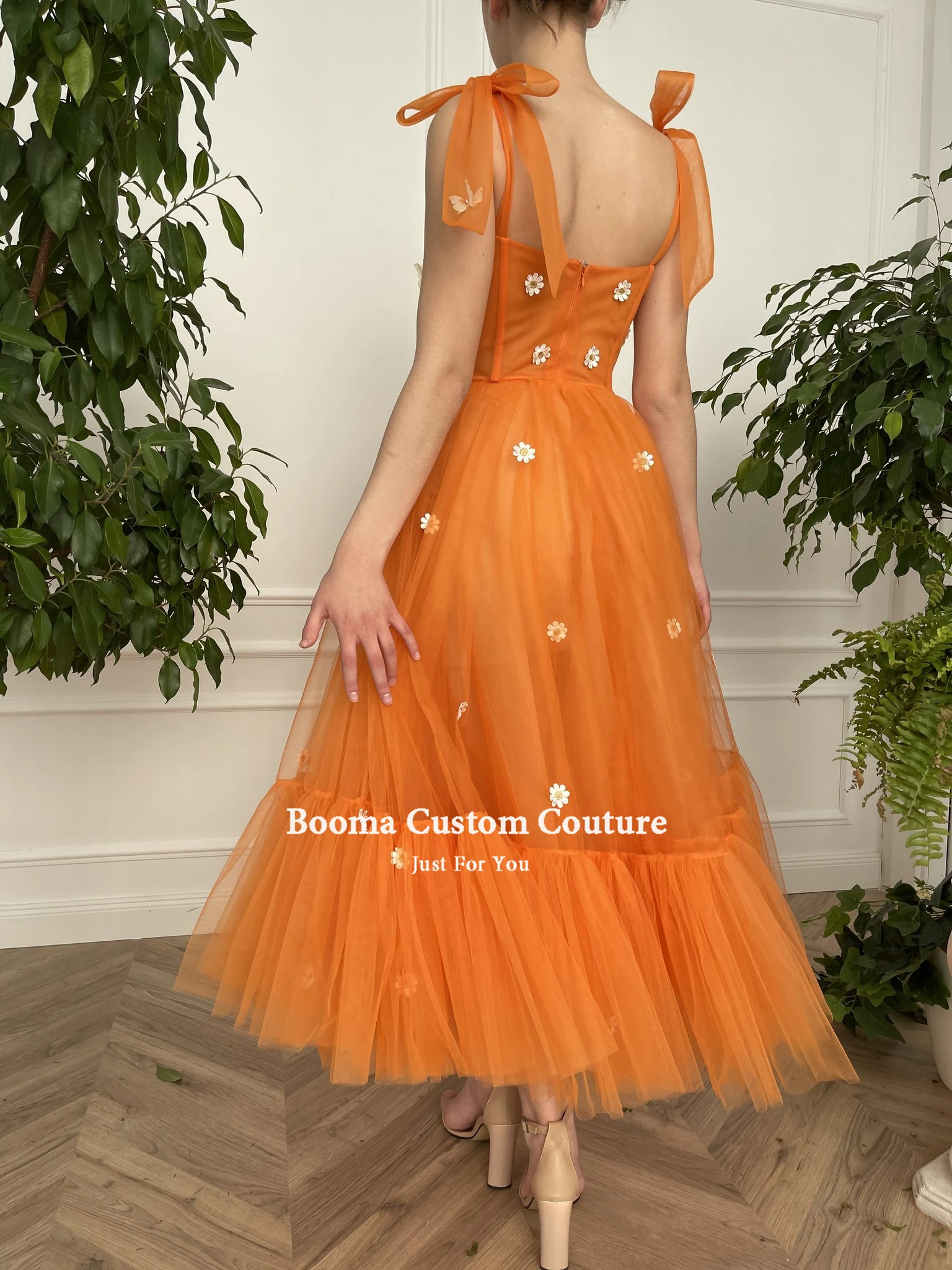Платье для выпускного из тюля Booma, оранжевое платье до середины икры с бантом на лямках и цветами маргариток, платье для выпускного вечера, ТРАПЕЦИЕВИДНОЕ ПЛАТЬЕ средней длины для свадебной вечеринки