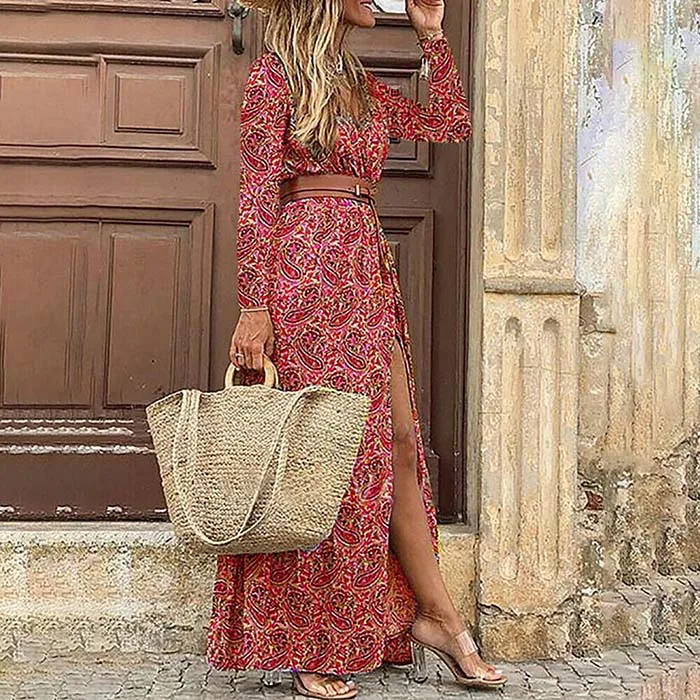 Женское богемное платье с длинным рукавом и V-образным вырезом