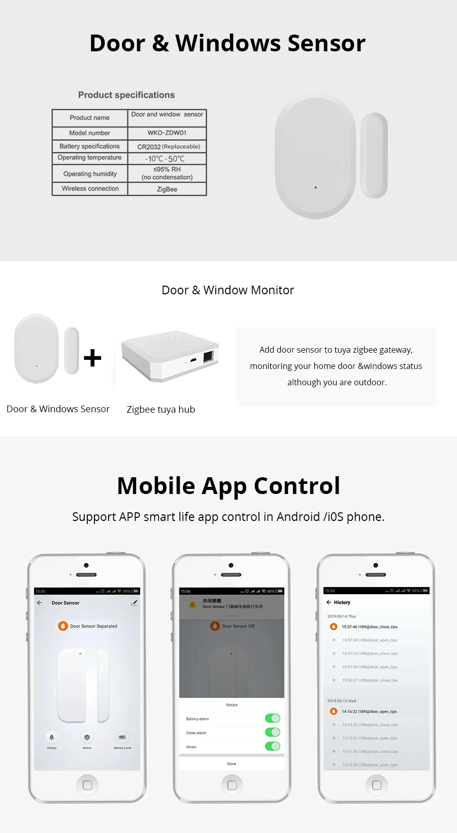 Обзор:Наш датчик двери очень работает! Его легко установить и использовать после подключения к концентратору ZigBee! Это пульт дистанционного управления Tuya APP. Приведет вас к умной жизни!Особенности:【Наслаждайтесь своей умной жизнью 】после подключения с ZigBee Hub, когда вы выходите из дома, он будет толкать вам сообщение уведомления, когда дверь/Окно открывается, так что вы можете обнаружить нарушителя во времени.【APP Remote control】загрузите приложение «Tuya/Smart Life» из GooglePlay или APP Store, чтобы добавить устройство для обнаружения состояния вашей двери/окна. Домашняя безопасность в вашей руке постоянно.【Share контроль и история записей tracking】вы можете поделиться устройством с семьей и отслеживать историю деятельности датчика.【Легко установить 】 Просто прикрепите одну часть к вашей двери или окну и прикрепите другую часть к дверной или оконной раме с помощью двусторонней клейкой ленты всего за несколько шагов.【Ультра низкое энергопотребление 】супер низкое энергопотребление, оповещение о низком заряде батареи. Время работы от аккумулятора: 1 год (25 раз/день); 2 года (10 раз/день). Нормальный WIFI датчик для двери батареи может работать только около 6 месяцев.Характеристики:Два состояния: открытый и закрытыйИсточник питания: 1 * CR2032 (в комплекте)Ток в режиме ожидания: ≤ 5μAТок сигнала тревоги: ≤ 80 мАВремя работы в режиме ожидания: 12-24monthsРасстояние сигнализации: ≥ 15 ммПротокол: ZigBeeПриложение: SmartLife/TuyaМатериал: Улучшенный АБС-пластикРабочая температура: -20 ℃ ~ 60 ℃Рабочая влажность: 20% ~ 85%Размер: основной корпус (Д * Ш * В): 40*25*10 ммПервый корпус (Д * Ш * В): 22*7*10 ммИнформация о посылка:Посылка с размерами: подходящая. 4,5*2,5*1,5 см/1,7*0,98 * 0.59inВес посылка: подходит. 50 г/1,76 унцийПосылка:1 * Беспроводной датчик двери/окна1 * Руководство пользователя (на английском языке)1 * Набор наклеек