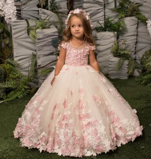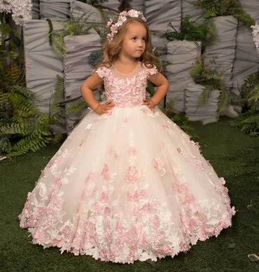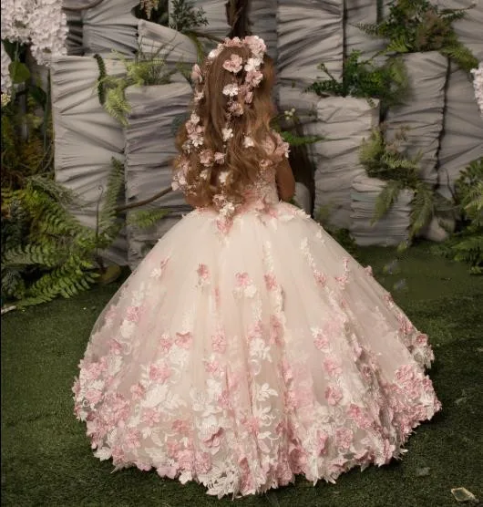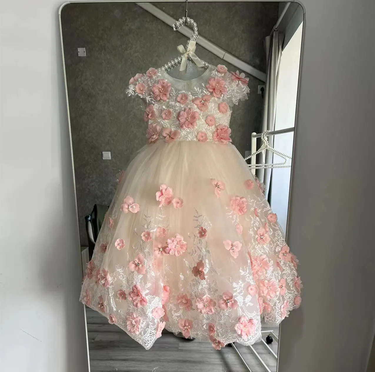 Платье для девочек, с 3D цветами, розовое, Бальное, с открытыми пле...