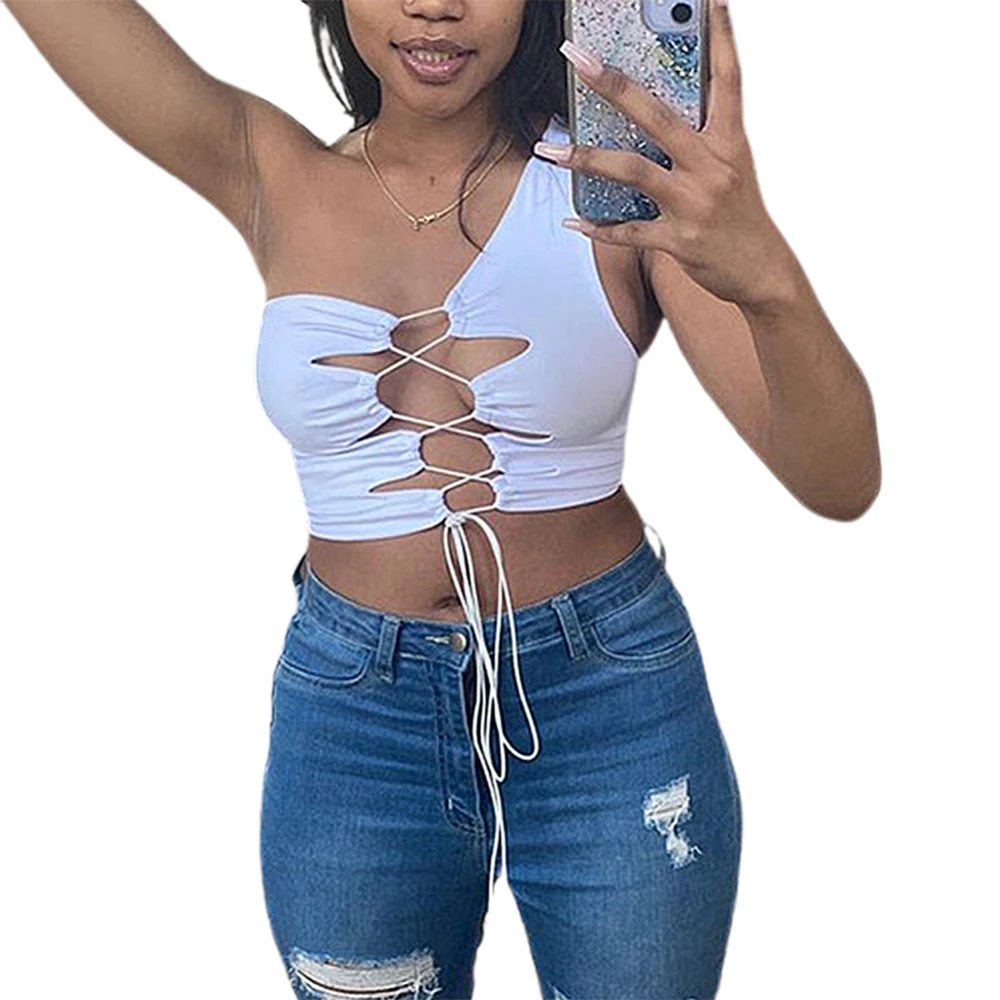Майка женская на одно плечо со шнуровкой, пикантный жилет, однотонная Красивая уличная одежда без рукавов, с завязкой спереди, уличная одежда