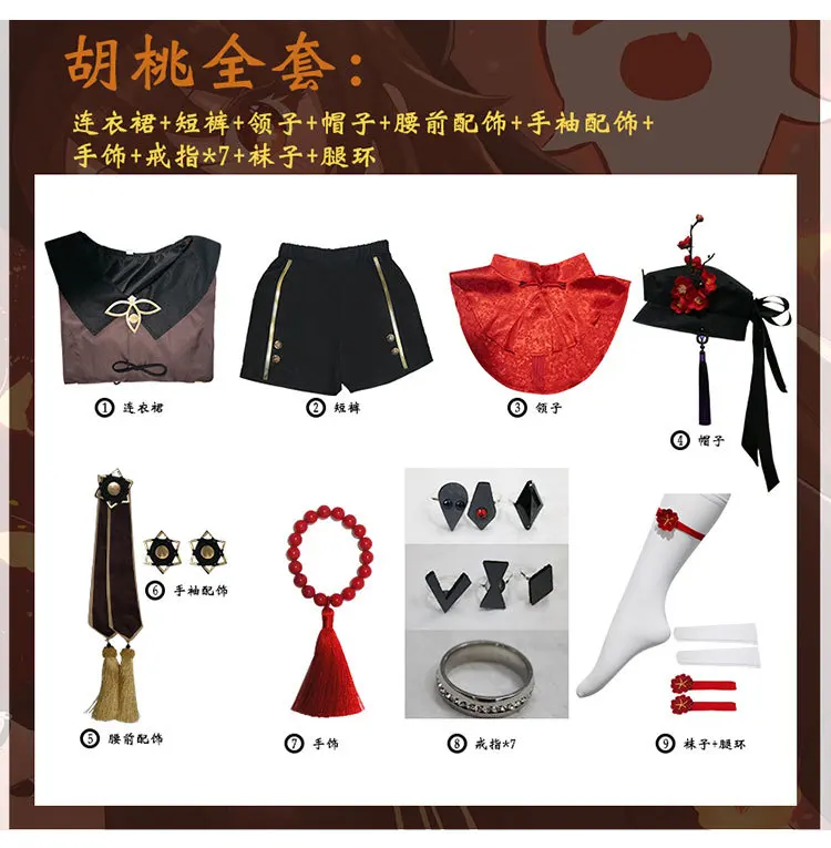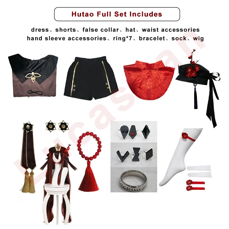Костюм для косплея Ху Тао, парик, кольца, шляпа, униформа для девочек