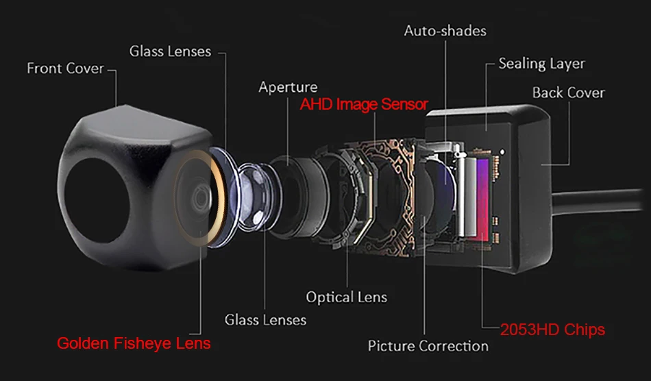 * Компоненты чипов: AHD Sony/OV2053HD* Угол обзора: реальный 165 градусов видимый диапазон.* Эффективные пиксели: AHD 1920*1080P , CVBS 1280*720P.* Формат сигнала: NTSC* Разрешение изображения: 200 Вт пикселей* Видео выход: AHD видео сигнал или CVBS сигнал.* Ночное видение: звездный свет ночного видения. Видимое расстояние больше 10 метров.* Изображение ночного видения: автоматическое управление коэффициентом усиления, автоматический баланс белого, компенсация автоматической подсветки• Объектив: 14/16 мм объектив рыбий глаз 6 стеклянных линз.* Низкое освещение: 0.01Lux* Отношение сигнал-шум: ≥ 69 дБ* Рабочий Источник питания: DC12V/2A* Рабочая температура: -45 °C ~ + 70 °C* Максимальная мощность: 3 Вт