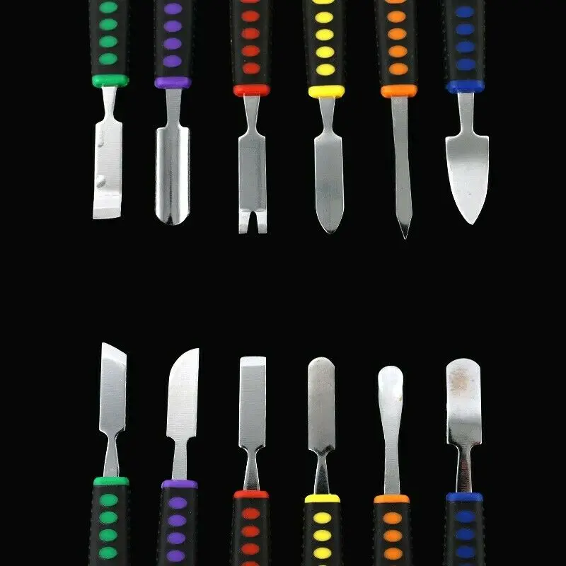 Набор металлических лопаток 6 в 1. Изготовлен из нержавеющей стали, прочный, но при этом гибкий. Конструкция с двумя наконечниками, различные лезвия для любой ситуации ремонта. Просты в использовании и обращении. Эргономичная силиконовая ручка, нескользящая. Цвет мокроты может меняться, пожалуйста, убедитесь, что вам все равно.