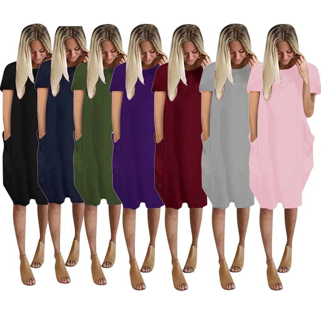 Женское повседневное однотонное летнее платье с круглым вырезом и карманами