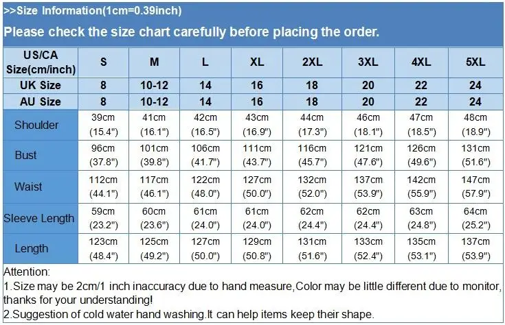 Информация о размере:[Наш Размер S] Обхват груди: 90 см/35,4 дюйма, обхват талии: 76 см/29,9 дюйма, ширина плеч: 40,3 см/15,9 дюйма, длина рукава: 60 см/23,6 дюйма, длина: 142,5 см/56,1 "(прибл.)[Наш Размер M] Обхват груди: 94 см/37 ", обхват талии: 81 см/31,9", ширина плеч: 41,5 см/16,3 ", длина рукава: 61 см/24", Длина: 144 см/56,7 "(прибл.)[Наш Размер L] Обхват груди: 98 см/38,6 дюйма, обхват талии: 86 см/33,9 дюйма, ширина плеч: 42,7 см/16,8 дюйма, длина рукава: 62 см/24,4 дюйма, длина: 145,5 см/57,3 "(прибл.)[Наши Размеры XL] Бюст: 102 см/40,2 ", обхват талии: 91 см/35,8", плеча: 43,9 см/17,3 ", рукава: 62,6 см/24,6", Длина: 147 см/57,9 "(прибл.)[Наш Размер 2XL] Обхват груди: 106 см/41,7 дюйма, обхват талии: 96 см/37,8 дюйма, ширина плеч: 45,1 см/17,8 дюйма, длина рукава: 63,2 см/24,9 дюйма, длина: 148,5 см/58,5 "(прибл.)[Наш Размер 3XL] Обхват груди: 110 см/43,3 дюйма, обхват талии: 101 см/39,8 дюйма, ширина плеч: 46,3 см/18,2 дюйма, длина рукава: 63,8 см/25,1 дюйма, длина: 150 см/59,1 "(прибл.)[Наши Размеры 4XL] Бюст: 114 см/44,9 ", обхват талии: 106 см/41,7", плеча: 47,5 см/18,7 ", рукава: 64,4 см/25,4", Длина: 151,5 см/59,6 "(прибл.)