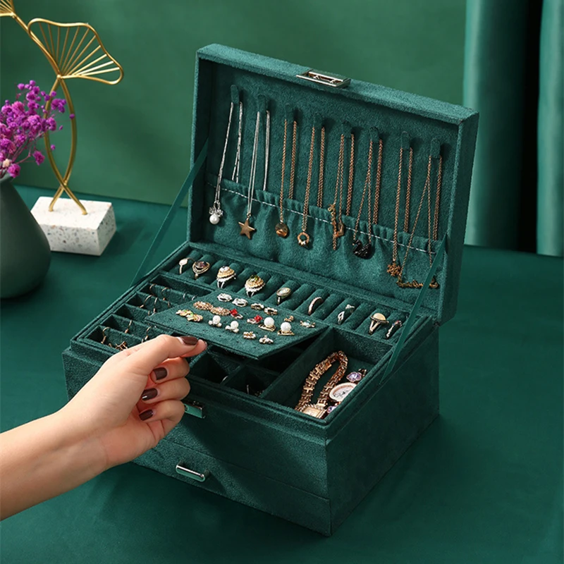 Новый 3-слойный зеленый фланелевый органайзер для ювелирных изделий, большой органайзер для колец, ожерелий, держатель для макияжа, бархатная шкатулка для ювелирных изделий с замком для женщин