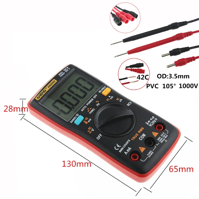 B03D AN8009 True-RMS автоматический Диапазон Цифровой мультиметр NCV Омметр переменного/постоянного напряжения АмперметрOOTDTYAN8009 True-RMS автоматический Диапазон Цифровой мультиметр NCV Омметр AC/DC Напряжение Амперметр измеритель тока Измерение температурыОсобенности:С большим обзором ЖК-дисплея с подсветкой, дата может быть четко показана.Подсветка позволяет легко считывать дисплей в темном состоянии.Маленький размер, портативный с мешком, вы можете взять его в любом месте, где вам это нужно.Компактный эргономичный дизайн, выглядит очень красиво.Использование одной рукой идеальный выбор для измерения.Позволяет проводить различные электрические испытания, включая испытания на сопротивление, напряжение постоянного/переменного тока и ток с простым переключателем.Легко работать, автоматическое определение точного измерения с самокалибровочным чипом, чтобы убедиться в точности и стабильности.Характеристики:Номер модели: AN8009Рабочая температура: 0 - 40 °CРабочая влажность: ≤ 75% относительной влажностиВлажность хранения: ≤ 80% относительной влажностиПринадлежности для DIY: электрическиеРежим работы: Авто/руководствоДиапазон измерения индуктивности: нетДиапазон измерения температуры: -20 ~ 1000 °C/-4 °F-1832 °FДиапазон измерения емкости: 9.99nF/99.99nF/999.9nF/9,99 мкФ/99,99 мкФ/999,9 мкФ/9.999MFДиапазон измерения напряжения: 999.9 мВ/9,999 в/99,99 в/999,9 вДиапазон измерения тока: 60 мА/600 мА/10 АДиапазон сопротивления измерения: 99,99/999,9/9,999 k/99,99 k/999,9 K/999,9 MЧастота: 99,99 Гц/999,9 Гц/9,999 кГц/99,99 кГц/999,9 кГц/9,999 МГцКвадратный волновой выход: 50 Гц/100 Гц/200 Гц/300 Гц/400 Гц/500 Гц/600 Гц/700 Гц/800 Гц/900 Гц/1000 Гц/200Напряжение постоянного/переменного тока (МВ): 9. 999мв/99,99мвНапряжение постоянного/переменного тока (В): 999.9 мВ/9,999 в/99,99 в/750ACV(999.9DCV)DC/AC Ток (mA & A): 999.9mA/9.999ADC/AC Ток мкА): 99,99 μA/999,9 μAТип дисплея: цифровой дисплейДиодный Тест: ДаНепрерывность: ДаРабочий цикл: 1%-99%Частота образцов: 3 раза в секундуМощность: 2*1,5 V AAA батареи (не входит в комплект)Цвет: красный, оранжевый (по желанию)Посылка включает в себя:1 мультиметр1 х тестовый свинец + датчик температуры1 x Руководство пользователя1 х сумка для хранения1x16 шт испытательный зонд
