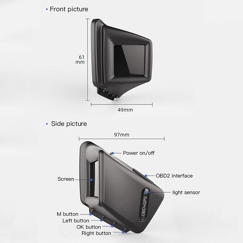 Материал: АБС-пластикЦвет: черныйСистема: OBD + GPSРазмер экрана: 2 дюйма LCDРазрешение экрана: 240*240Чистый металл Размер: около 9,7*6,1*4,9 см/3,82*2,40*1,93 дюймовВес голого металла: около 40 гДлина линии: 175 см
