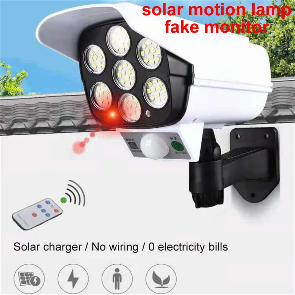 Солнечный светильник, датчик движения, муляж системы безопасности, камера, поддельный monitior, беспроводной наружный прожектор, светильник IP65, водонепроницаемый, 77 светодиодный светильник, 3 режима для домашнего сада с пультом дистанционного управления