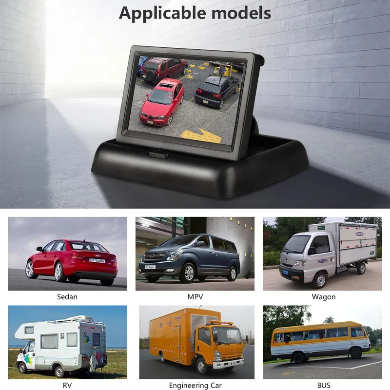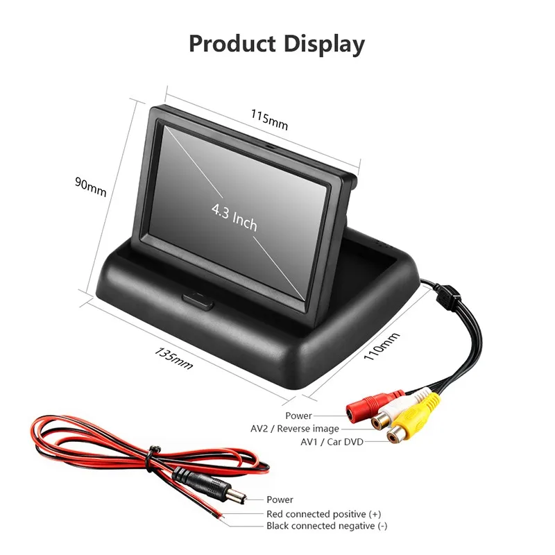 Беспроводной Автомобильная камера заднего вида 4,3 дюймов Автомобильный монитор заднего вида для парковки Особенности: 1. Беспроводная система мониторинга заднего вида может помочь вам повернуть назад или парковаться. 2. Полноцветный TFT LCD 2-КАНАЛЬНЫЙ AV видео вход вид спереди или вид сбоку, низкое энергопотребление. 3. Профессиональная Водонепроницаемая Автомобильная камера заднего вида ночного видения. 4. Подключите монитор к шнуру питания, а затем Подключите камеру к монитору в соответствии с инструкцией по эксплуатации. 5. Нет аудиовхода или выхода, совместимость NTSC/PAL 6. Нажмите кнопку, чтобы сложить дисплей 7. Он питается от подключения питания транспортного средства и используется для установки на нижней стороне клея приборной панели Характеристики продукта: Название продукта: 4,3 дюймов ЖК-дисплей складной дисплей Цвет изделия: черный Размер изделия: примерно 4,3x5,25x4,25 дюйма (высота x Ширина x глубина) Материал корпуса: АБС-пластик Экран Размер: 4,3 дюйма TFT 16:9 Экран. Разрешение: 800x480 Стандарт: PAL/NTSC Видео вход: AV1/AV2 Рабочий Источник питания: 9-24 В постоянного тока Потребление тока: 3 Вт (максимум) Рабочая температура: -20 ~ 50 градусов Цельсия Температура хранения: -30 ~ 70 градусов Цельсия Яркость экрана: 300 нит Контрастность: 250:1 Упаковочный лист: 1x4,3 дюймов дисплей 1 х шнур питания Посылка Вес: 250 г Примечание: Возможны отклонения в размере от 1 до 2 см при измерении вручную Из-за различного оборудования камеры и светильник дисплея цвет и изображение продукта могут иметь ошибки, пожалуйста, обратитесь к фактическому продукту